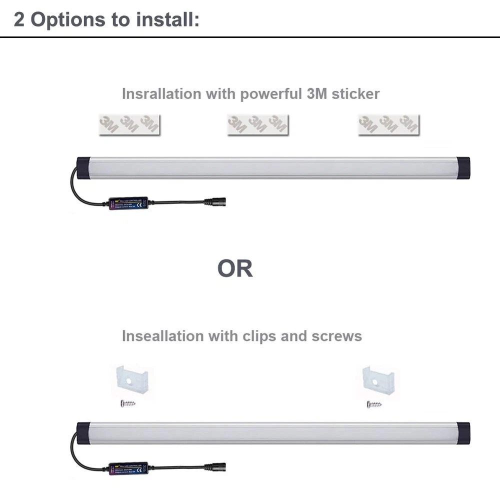 Features: Guarantee: "" All of our lamps come with a full 3-year warranty. Long life,low power consumption,low heat generation,released high intensity,Maintenance free,easy installation. High brightness,excellent quality,stable performance,and wide lighting angle. The aluminum profile is with nice coating treatment so it looks elegant. Specifications: Luminous Flux: 720-800Lm Wattage: 8W Emitting Color: Warm/Natural/Neutral/Daylight/Cool White Voltage: AC100~240V, DC12V Shell: U shape Aluminum alloy shell Waterproof: IP50 Size: 24 * 1.0 * 0.33inch (L*W*H) Individul/Group Control: The RF remote control factory set is one-to-one remote control mode. When you need a remote control to control multiple lights, please restart all the lights require to control at the same time (unplug the power and plug to restart) and then long press the red button of the remote control turn on the lights untill all the lights turn white, that means the simultaneously control multiple lights setting is successful. Package Included: 1PC - 24in LED Bar 1PC - 12V power supply 1PC - RF remote control 4pcs -3M tape 2pcs -Clips 3pcs -Screw for clips 3pcs -Cable clips Guarantee: If you are not satisfied for any reason, Please "Contact Seller" directly. We aim to provide best services and promise to reply all emails in 24 hours. No hassles, no delays, and no unnecessary questions asked! 【RF remote & CCT】The wireless remote control can control the color at any time within the effective distance(MAX 66ft) without failing due to obstacle blocking. Use the CCT shortcut key to select common lighting such as warm /natural/daylight/cool white etc or use the CCT +/- key to steplessly change the color temperature light between 2700-6500K. 【Dimming & Dynamic mode】Long press to get 1%-100% stepless dimming; short press for 7 level dimming. Built-in 6 dynamic: warm white/neutral white/Cool white fade & Jump. 【Memory function】It will stay on the brightness level/color/mode you set last time when power back on, Can work with Smart Plug or Timer. 【Durable & Safe 】Made of aluminum and plastic, low profile and light weighted, frosted PC cover makes the light softer for the eyes. The voltage of this light is DC12V that makes them safe to touch. 【Easy to Install】It can be installed by yourself in seconds. two flexible mounting ways: Double sided tape options(no damage to the cabinet ) or Simple screws method.