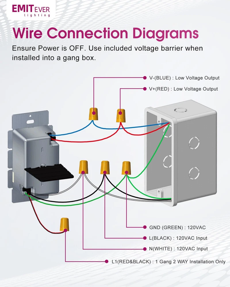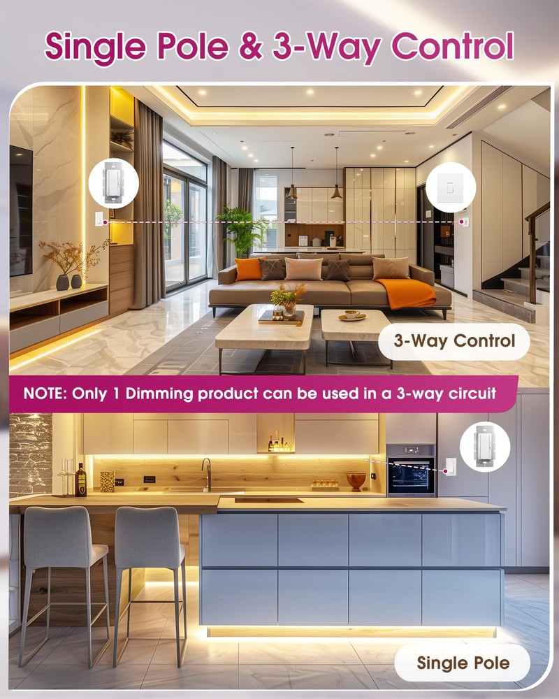 Dimmer Light Switch & 12V 60W Dimmable Driver 2 in 1, UL Listed Single-Pole or 3-Way Slide Dimmer Switches for Lights,120VAC to 12VDC Power Supply for Low Voltage Project, Glossy White Driver & Dimmer 2-in-1 Design: dimmer light switch built-in Driver, no need of separate dimmable power supply and dimmer light switch installations, saving 80% space in junction boxes or tight corners (4.13x2.12x1.99in compact size). Smooth glossy white finish looks great and enhances the feel of your home Single Pole or 3-Way: Circuit settings allow to control the light ON/OFF and can be wired as a single pole (1 switch) or 3-way (2 switches) to control lights from multiple locations. Note: only 1 dimmer switch can be installed in a 3-way circuit Smooth & Reliable Dimming: 12V 60W driver & dimmer switch can easily use sliders for full-range 0.3%-100% with no flicker and no buzzing. Adjust dimming curves and set brightness ranges via the initial brightness controller for work, relaxation, or sleep Safety Protection: UL/cUL Listed, FCC, Class 2 Certified, with protections of short circuit, overload, and over temperature, ensuring safety for both the power supply and your projects Universal Compatibility: Works with 12V DC lighting systems, perfect for strip lights, under-cabinet lights, kitchens, bedrooms and other low-voltage applications for both home and commercial projects. Easy to Install: Compact Slim Design is shallower to easily fit in crowed electrical boxes, directly replacing existing switches or dimmers with traditional single pole or standard 3-way wiring Memory Function: On/Off rocker switch remembers the last dimmed light setting and turns on to that exact light level. Simple and elegant horizontal slider dims and brightens with full range light control
