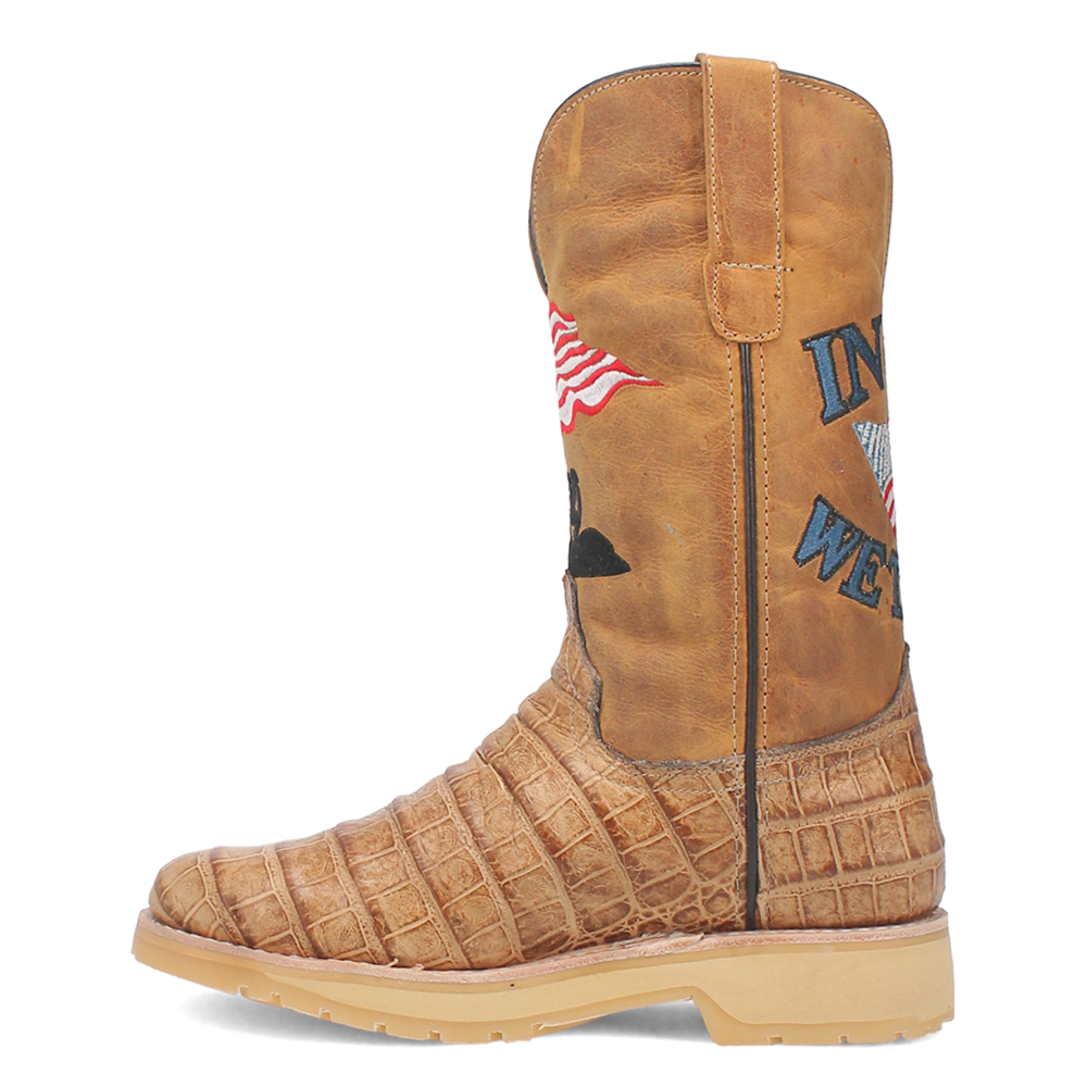 Patriot Embroidered Patriotic Croc Round Toe Cowboy Boots Product Details Leather Upper Pull-On Cushion Comfort Insole Tpr Rubber Outsole Unit Heel Raise the flag and pledge your allegiance to the stars and stripes with the all-leather, Patriot boot from Dingo1969. This country-loving, 11-inch boot comes with a textured leather design on the foot, a round toe, rubber outsole and cushion comfort insole. Additional Details Color: Brown Occasion: Casual Gender: Mens Age: Adult Brand: Dingo