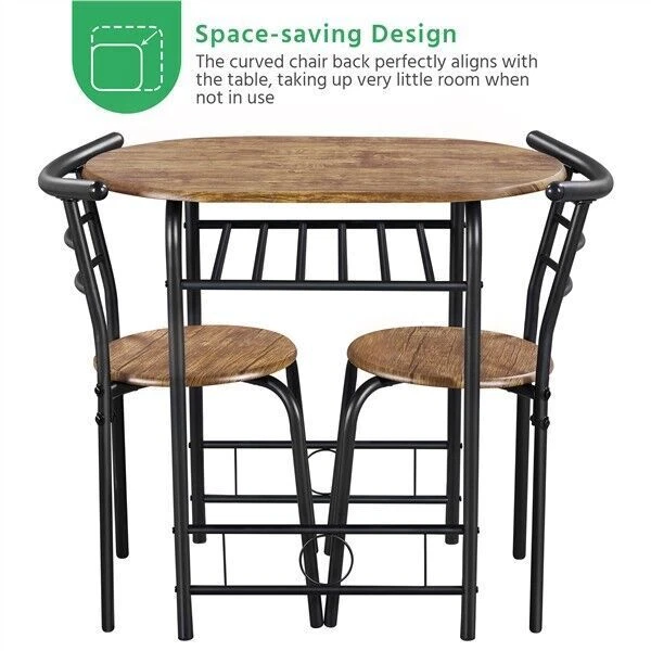 【Designed for Small Spaces】Measuring 31.5’’ L x 21’’ W, the oval tabletop is large enough for 1-2 people to dine, read or have a close chat cozily. The chairs perfectly fit the curving edges of the table, allowing you to entirely tuck them away when not in use to free up extra space for you. The space-saving design makes this set the perfect accent for compact spaces. 【Supportive & Firm】This kitchen table set includes 2 chairs with a mid-height backrest and round wooden seat. A curved slat backrest perfectly wraps your back and gives you strong body support. You can also add seat cushions to achieve a softer sitting experience. 【Extra Storage Rack】Fitted with a convenient rack under the tabletop, this breakfast table provides additional storage space for wine bottles, napkins and other essentials, or you can remove the shelf for extra leg room. The timeless color scheme and small dimensions make this set perfect for the kitchen, balcony, bedroom, apartment, dorm room, office, temporary activity & party, etc. 【Compact Size】Measuring 31.5’’ L x 21’’ W, the compact oval tabletop allows one or two people to dine, work, study, play cards or chat as wanted. The lightweight design makes this set easy to move around for your changing needs. It could perfectly fit into a small kitchen, dorm room, apartment or a corner of your house to create a cozy nook for dining or relaxation. 【Considerate Details】Rounded edges of the table reduce the risk of people hitting their bodies, making this 3-piece table set safe for all family members. Reinforced chair structure ensures a steady sitting experience. Packing List: