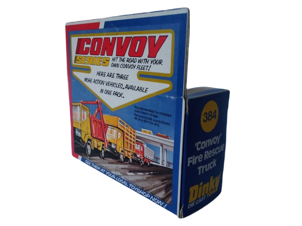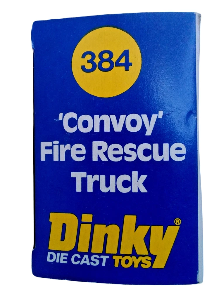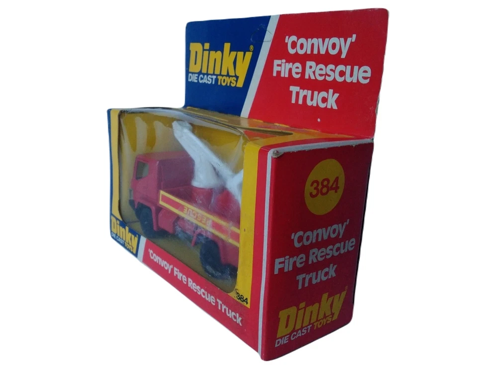 Dinky Convoy Fire Rescue Truck #384 Diecast Model Firetruck Vintage item circa 1970's Factory error - "Rescue" decal is upside down on side of truck Has extremely small amount of feathering/curling at corners and a few rough edges; slight scuffing and denting along with adhesive residue from price tag on plastic Overall great condition with solid box construction, unyellowed and unbroken plastic, bright and vibrant colors, clear and crisp graphics, and mint contents The error makes it a hard to find rarity Will make a great addition to your collection!