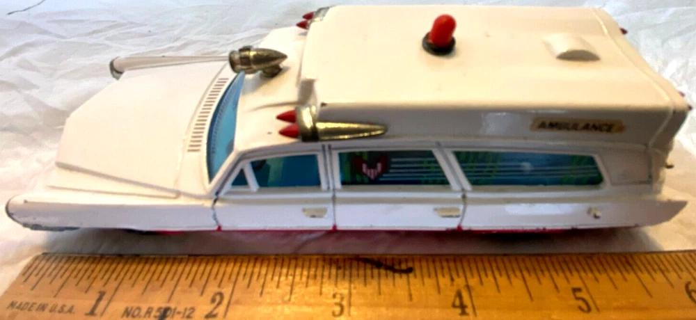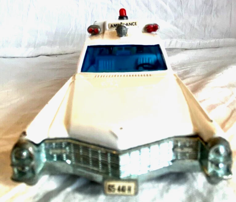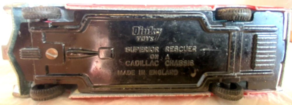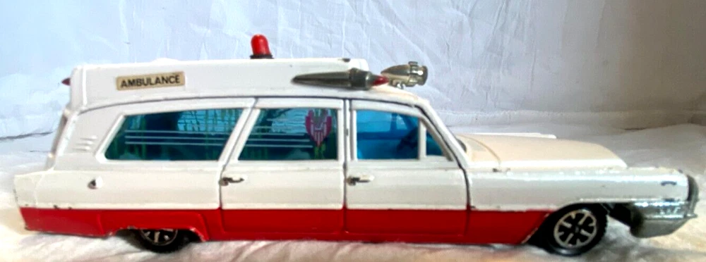 Hey Dinky Toy Lovers, Here is a must have for your collection. In the 1970's Dinky Toys decided to manufacture this 1973 Superior Criterion Rescuer Ambulance on a Cadillac Chassis, no suspension, dummy beacon, one-piece molded plastic wheels and tires, 4-spoke rims, with blue tinted windows. It is a Replica of Ambulance - Superior Coach Corporation (USA). It is 1:43 scale. You already know Dinky Toys are made in England. As always Dinky Toys makes awesome Toys & this is no exception. It's made of Diecast Metal & although it's preowned, this one is in very good condition. Unfortunately, there is no box with it. The back door opens to reveal a patient on a stretcher that comes out, so realistic, right. The license plate reads, "65-441-H" & I'd love to know it's history, but I do know it is Ref. #288C. Don't miss out on this offer if you're a Dinky Toy, Ambulance or just any type of Toy Collector. Smoke Free Environment Stored for 25+ years (Seller Cat.#0343) Ref. #288 (A), 1971, dummy beacon; Ref. #288B, 1972, no suspension, dummy beacon, one-piece molded plastic wheels and tires, 4-spoke rime; Ref. @#288C, 1973, as previous toy, with blue tinted windows;
