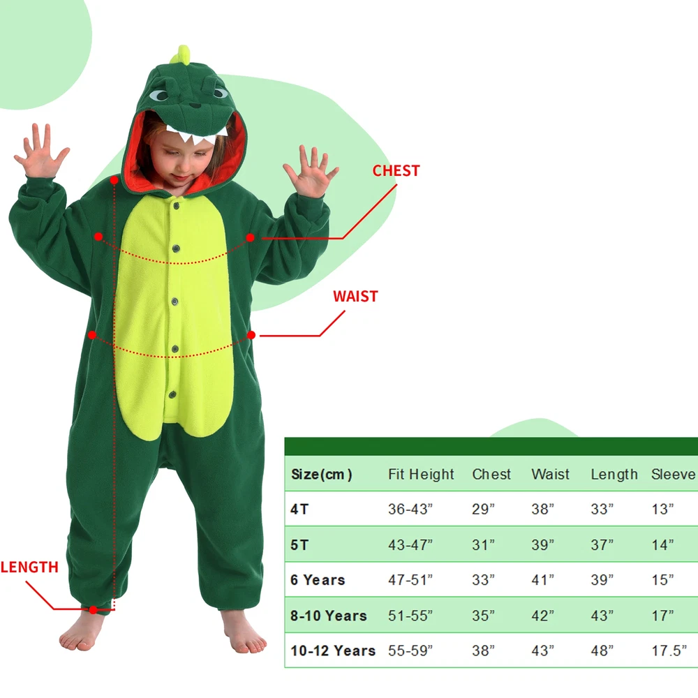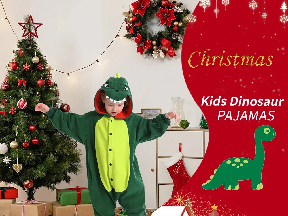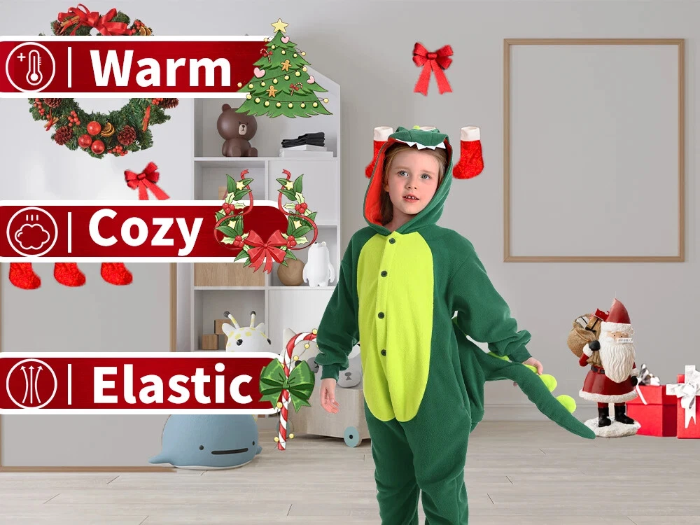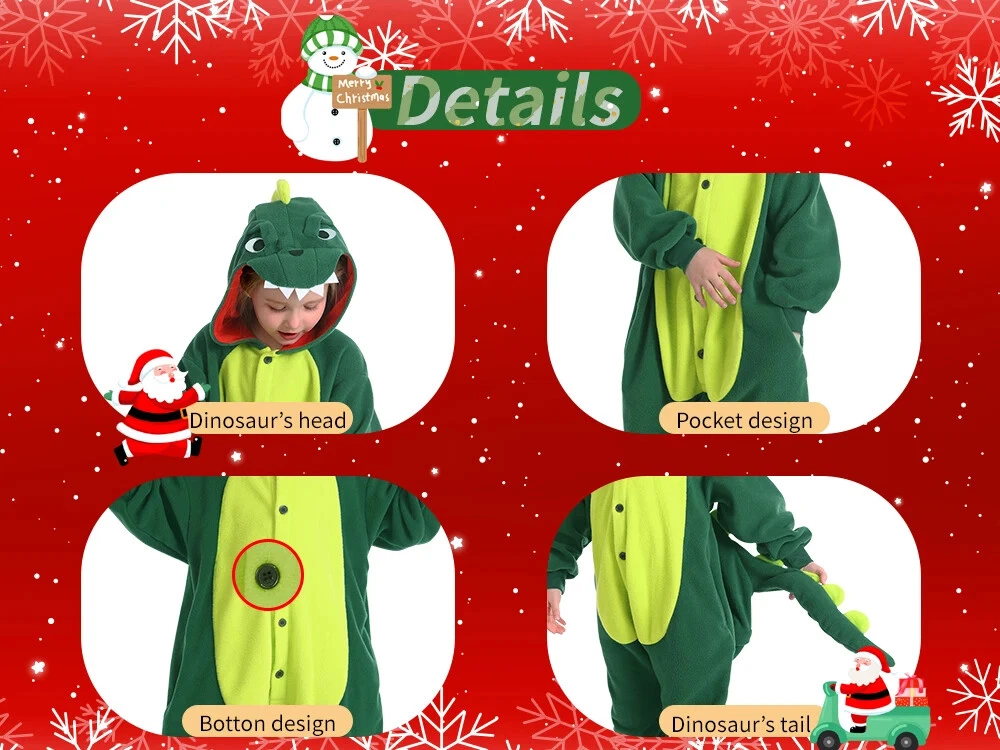 This Christmas, let's make our homes a haven of warmth, laughter and unforgettable memories - all in these festive dinosaur one-piece pajamas. The kids dinosaur suits are made of high quality polyester. Soft,skin-friendly and elastic,keeping children comfortable all day long. Dinosaur one-piece sleepwears using only the finest eco-friendly materials. They are free from irritants and unpleasant odors, ensuring your child sleeps peacefully and safely. Details The hat is designed according to the real appearance of the dinosaur , which is cute and fashionable. On the back of pijamas de dinosaurios para niños are designed a lovely dinosaur tail. Front button design in accordance with the dinosaur pjs for kids. At the same time easy to button,strict . The pockets are designed to keep children's hands free and warm at the same time. Occasions On chilly winter evenings,our dinosaur hooded onesie pajamas for girls and boys provide extra warmth and coziness. Whether watching a movie, reading a book, or simply relaxing in bed, the material keeps one comfortably warm. On lazy weekend mornings or afternoons, the soft dinosaur suits are perfect for lounging around the house, doing nothing in particular, and simply enjoying the comfort of being cozy and warm. When you just need to run a quick errand, like checking the mailbox or grabbing a few items from the store, the pajamas can serve as a casual and comfortable outfit. Children often love pajamas with fun designs like dinosuar. These cute animal pajamas can make bedtime more exciting and help children feel cozy and ready for a good night's sleep. During holidays like Christmas or Halloween, dinosaur themed pajamas like these can be a great way to celebrate. They add to the festive atmosphere and make for fun photos and memories. When hosting a sleepover or pajama party, dragon costume kids add a fun and unique element. Children can play, watch movies, or simply hang out in their dinosaur pajamas, creating memorable experiences. The Shipping We will ship the item within 1-3 days after receiving the payment. Feedback If you find any problems (for example size, broken,color ,wrong item and so on) after receiving the goods, please contact us in time,we will try our best to solve you problems. If you are satisfied with the product,please give us five stars.