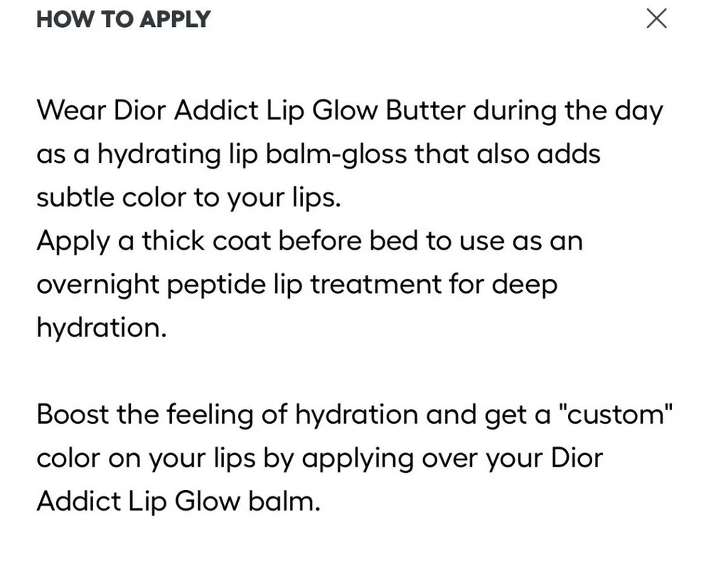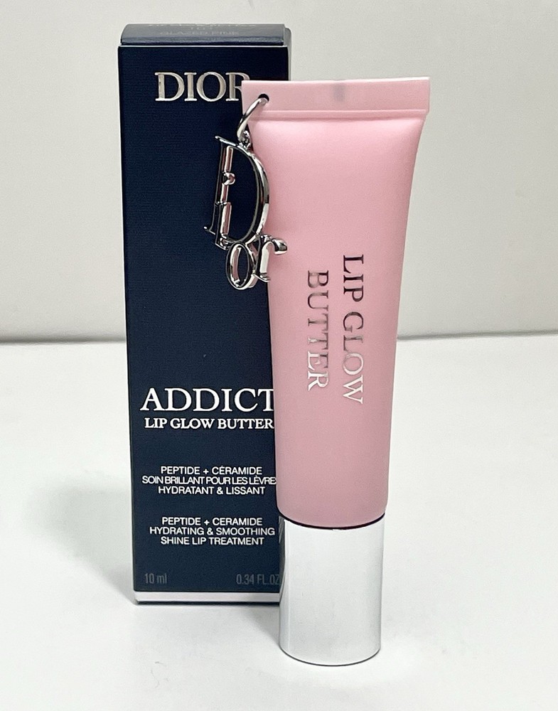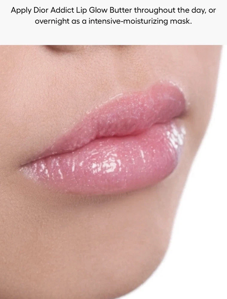 Authentic New 2025 Dior collection Includes original Dior pouch The peptide and ceramide duo supports the skin barrier and helps smooth and protect lips from external stressors. Cherry oil helps maintain hydration and gives a plumping effect. Made with 90% natural-origin ingredients.' HOW TO APPLY Wear Dior Addict Lip Glow Butter during the day as a hydrating lip balm-gloss that also adds subtle color to your lips. Apply a thick coat before bed to use as an overnight peptide lip treatment for deep hydration. Boost the feeling of hydration and get a "custom" color on your lips by applying over your Dior Addict Lip Glow balm Lightly tinted shades with a high shine and non-sticky finish - Gloss-balm hybrid formula that supports the skin barrier and hydrates for 24 hours' - Lips feel ultra-comfortable and soothed for 8 hours? 1 Instrumental test on 30 women. 2 Self-rating test on 30 women.