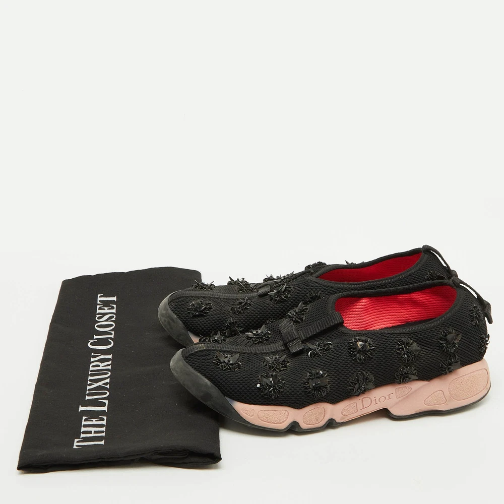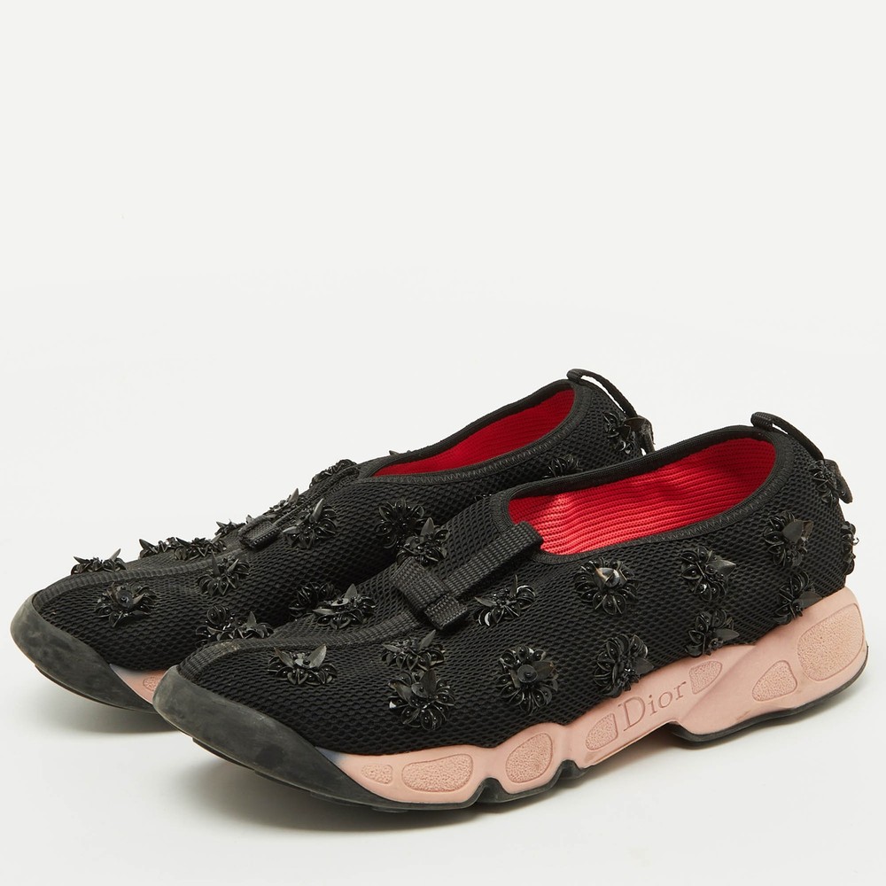 These Dior sneakers are all about making a statement while keeping comfort in check. The durable rubber sole ensures you’ll glide through your day with ease, whether you’re running errands or meeting friends.Certified by The Luxury Closet - This item has gone through a detailed authentication process overseen by our experts. We offer a lifetime guarantee of authenticity on all our items. Import duties, taxes and charges are not included in the item price. These charges are the buyers responsibility. Please check with your country’s customs office to determine what these additional cost will be prior to buying. Our eBay Store About Us Contact Us Add to Favorite Sellers Dior Black Mesh Floral Embellished Fusion Slip On Sneakers Size 37.5 $177.1 These Dior sneakers are all about making a statement while keeping comfort in check. The durable rubber sole ensures you’ll glide through your day with ease, whether you’re running errands or meeting friends. Product Details Brand Color Black Dimensions Material Mesh Size 37.5 Outsole Width 9.5 cm Outsole Length 27 cm Heel Height Includes The Luxury Closet Packaging Certified by The Luxury Closet This item has gone through a detailed authentication process overseen by our experts. We offer a lifetime guarantee of authenticity on all our items. How We Check The in-house team of experts at The Luxury Closet is highly trained to verify the authenticity and the condition of the luxury products. They ensure that only 100% authentic items are put on sale.The evaluation process is unique with its own mix of assessment criteria and differs according to the category. Each item is evaluated based on the following combination of hallmarks, hardware, stitching, symmetry, material, craftsmanship, stamping, codes, hologram stickers, and packaging. Our authenticators also check if the items have been modified or amended (e.g., aftermarket diamonds, replaced batteries, repaired bags, etc.) International Buyers Import duties, taxes and charges are not included in the item price. These charges are the buyers responsibility. Please check with your country’s customs office to determine what these additional cost will be prior to buying.