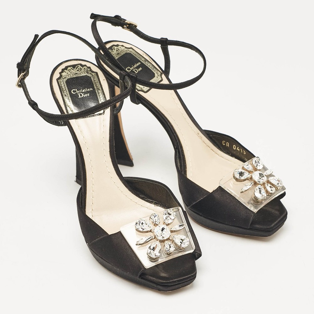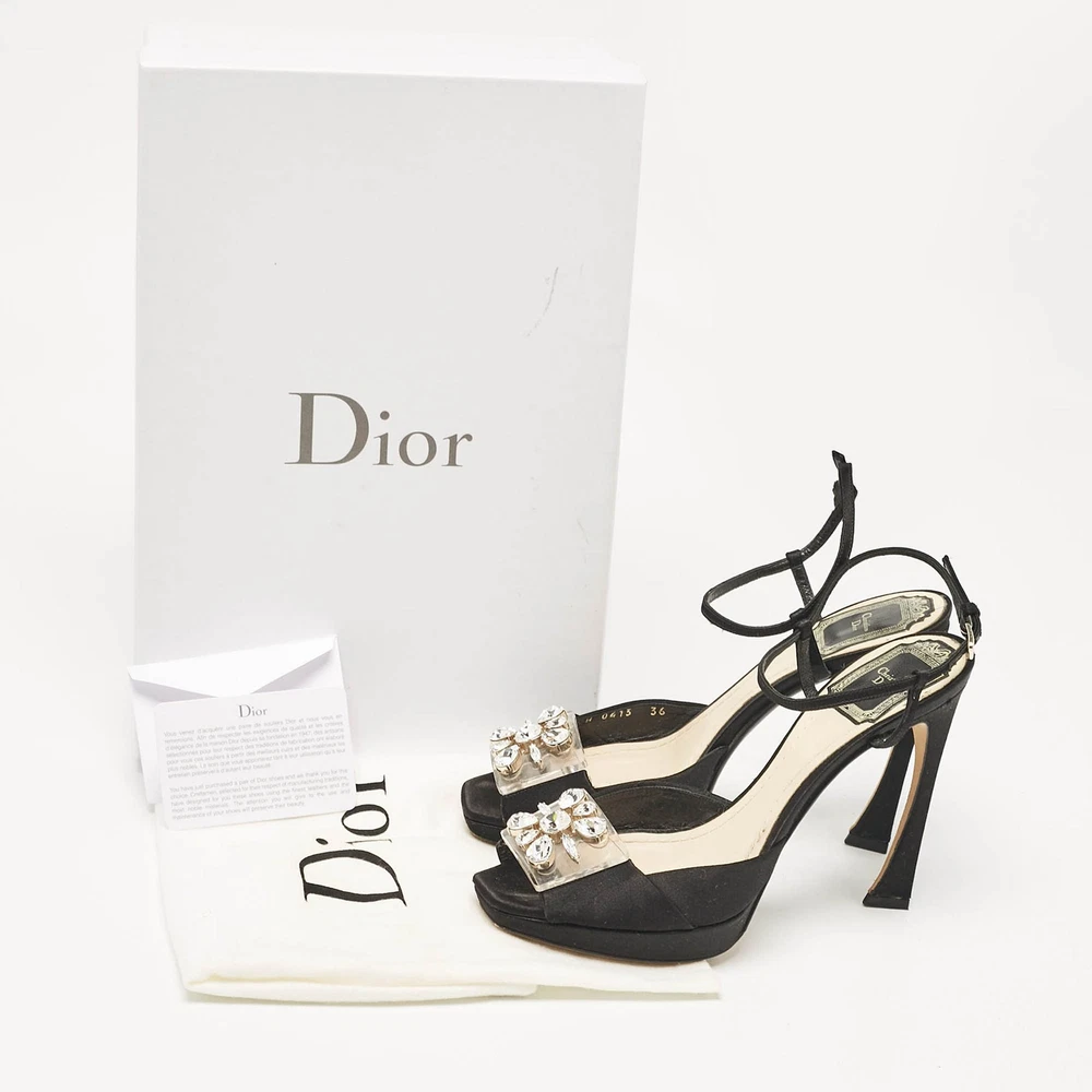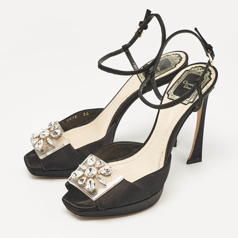 These sandals will frame your feet in an elegant manner. Crafted from quality materials, they display a classy design and comfortable insoles.Certified by The Luxury Closet - This item has gone through a detailed authentication process overseen by our experts. We offer a lifetime guarantee of authenticity on all our items. Import duties, taxes and charges are not included in the item price. These charges are the buyers responsibility. Please check with your country’s customs office to determine what these additional cost will be prior to buying. Our eBay Store About Us Contact Us Add to Favorite Sellers Dior Black Satin Crystal Embellished Ankle Strap Sandals Size 36 $135.3 These sandals will frame your feet in an elegant manner. Crafted from quality materials, they display a classy design and comfortable insoles. Product Details Brand Color Black Dimensions Material Satin Size 36 Outsole Width 7 cm Outsole Length 20.5 cm Heel Height 11 cm Includes Original Dustbag, Original Box, Info Card Certified by The Luxury Closet This item has gone through a detailed authentication process overseen by our experts. We offer a lifetime guarantee of authenticity on all our items. How We Check The in-house team of experts at The Luxury Closet is highly trained to verify the authenticity and the condition of the luxury products. They ensure that only 100% authentic items are put on sale.The evaluation process is unique with its own mix of assessment criteria and differs according to the category. Each item is evaluated based on the following combination of hallmarks, hardware, stitching, symmetry, material, craftsmanship, stamping, codes, hologram stickers, and packaging. Our authenticators also check if the items have been modified or amended (e.g., aftermarket diamonds, replaced batteries, repaired bags, etc.) International Buyers Import duties, taxes and charges are not included in the item price. These charges are the buyers responsibility. Please check with your country’s customs office to determine what these additional cost will be prior to buying.