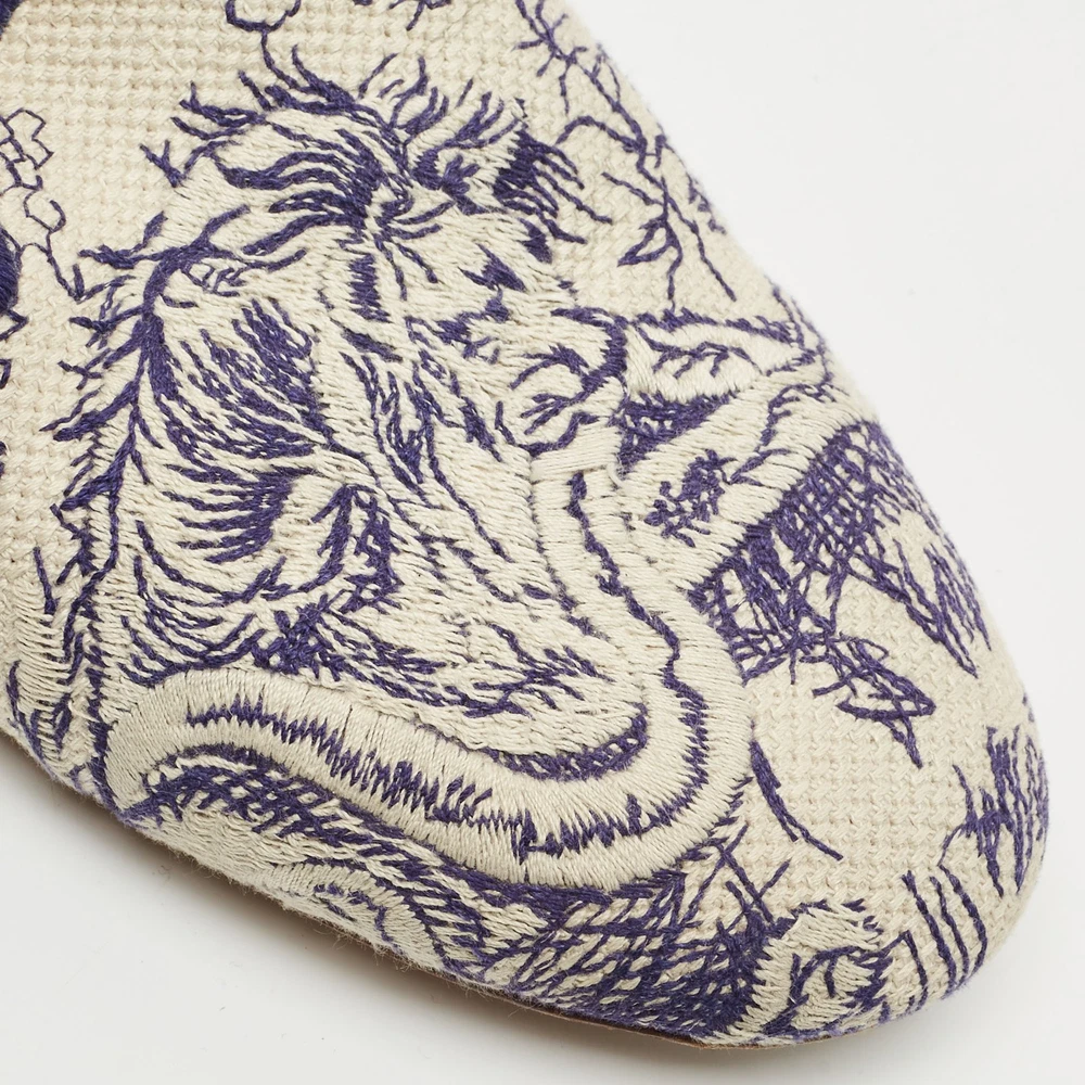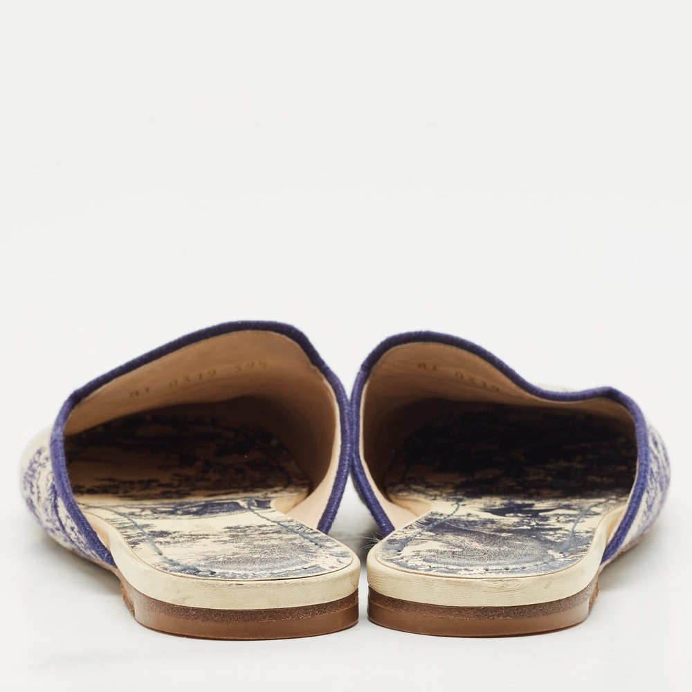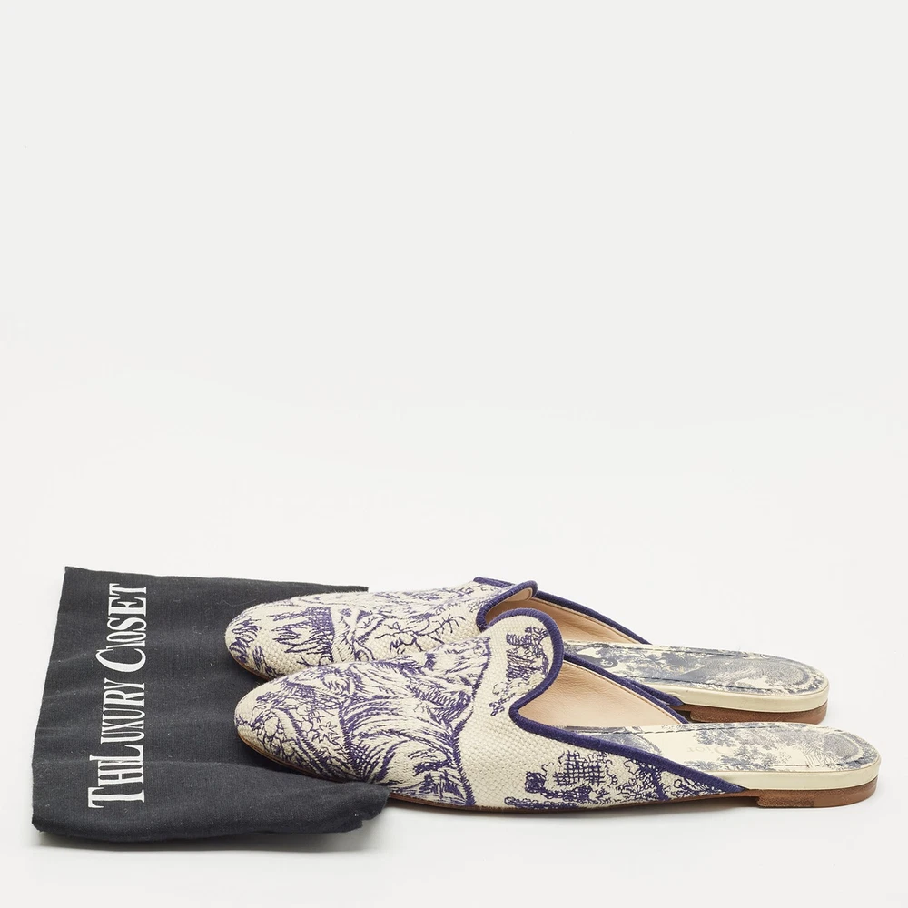 Step into timeless elegance with these Dior flat mules, featuring the house’s iconic Toile de Jouy motif in a refined blue and beige palette. Crafted from finely embroidered canvas, they blend heritage artistry with contemporary comfort. The slip on silhouette make them an effortless choice for sophisticated off duty styling or luxe resort wear.Certified by The Luxury Closet - This item has gone through a detailed authentication process overseen by our experts. We offer a lifetime guarantee of authenticity on all our items. Import duties, taxes and charges are not included in the item price. These charges are the buyers responsibility. Please check with your country’s customs office to determine what these additional cost will be prior to buying. Our eBay Store About Us Contact Us Add to Favorite Sellers Dior Blue/Beige Embroidered Canvas Toile De Jouy Flat Mules Size 39.5 $344.3 Step into timeless elegance with these Dior flat mules, featuring the house’s iconic Toile de Jouy motif in a refined blue and beige palette. Crafted from finely embroidered canvas, they blend heritage artistry with contemporary comfort. The slip on silhouette make them an effortless choice for sophisticated off duty styling or luxe resort wear. Product Details Brand Color Blue Dimensions Material Canvas Size 39.5 Outsole Width Outsole Length Heel Height Includes Certified by The Luxury Closet This item has gone through a detailed authentication process overseen by our experts. We offer a lifetime guarantee of authenticity on all our items. How We Check The in-house team of experts at The Luxury Closet is highly trained to verify the authenticity and the condition of the luxury products. They ensure that only 100% authentic items are put on sale.The evaluation process is unique with its own mix of assessment criteria and differs according to the category. Each item is evaluated based on the following combination of hallmarks, hardware, stitching, symmetry, material, craftsmanship, stamping, codes, hologram stickers, and packaging. Our authenticators also check if the items have been modified or amended (e.g., aftermarket diamonds, replaced batteries, repaired bags, etc.) International Buyers Import duties, taxes and charges are not included in the item price. These charges are the buyers responsibility. Please check with your country’s customs office to determine what these additional cost will be prior to buying.