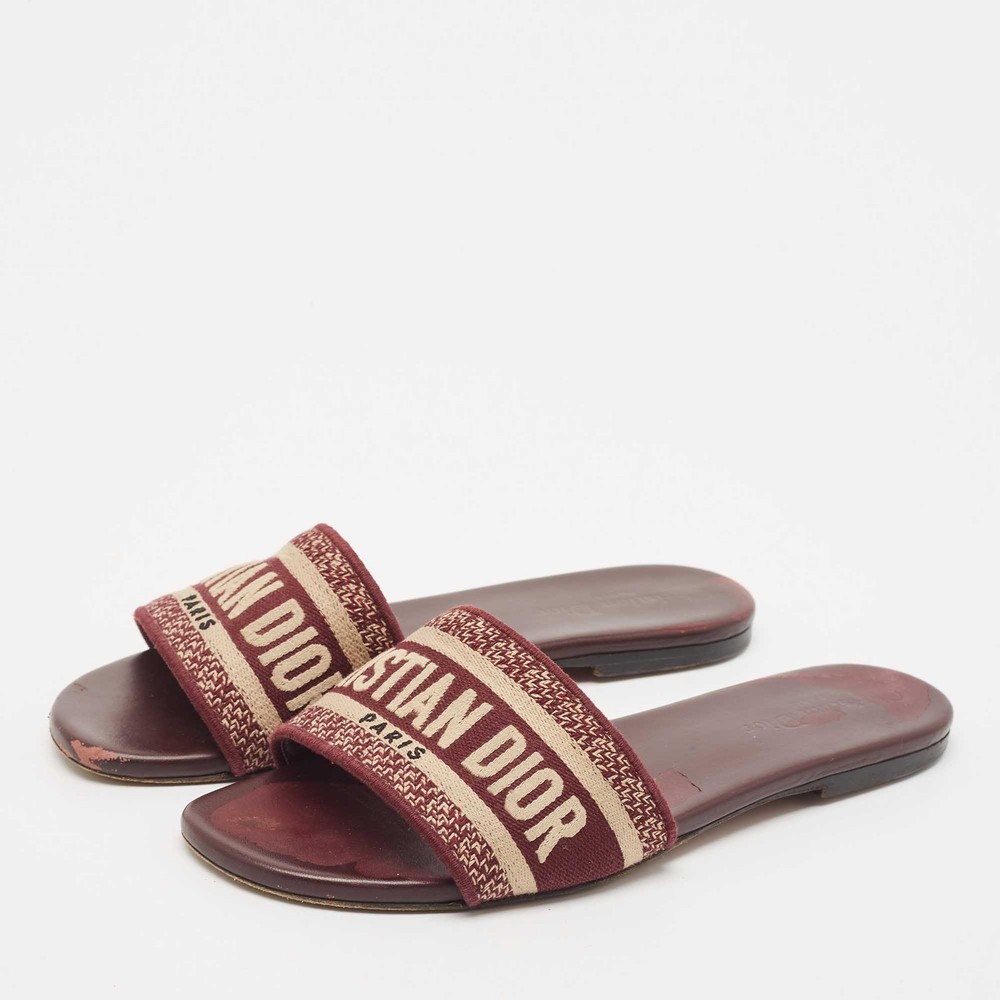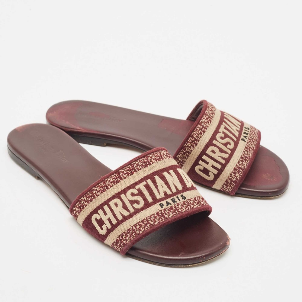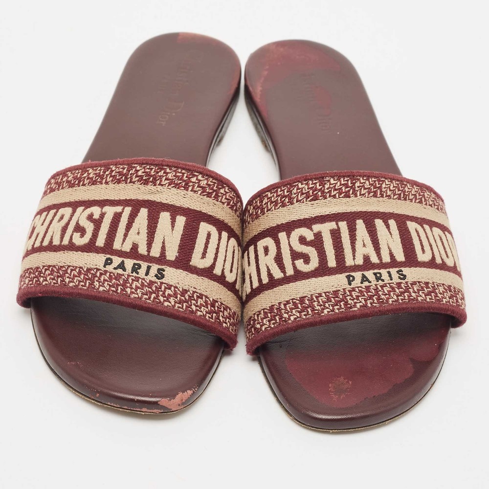Enhance your casual looks with a touch of high style with these Dior slides. Rendered in quality material with a lovely hue adorning its expanse, this pair is a must haveCertified by The Luxury Closet - This item has gone through a detailed authentication process overseen by our experts. We offer a lifetime guarantee of authenticity on all our items. Import duties, taxes and charges are not included in the item price. These charges are the buyers responsibility. Please check with your country’s customs office to determine what these additional cost will be prior to buying. Our eBay Store About Us Contact Us Add to Favorite Sellers Dior Burgundy Embroidered Canvas Dway Flat Slides Size 38 $323.4 Enhance your casual looks with a touch of high style with these Dior slides. Rendered in quality material with a lovely hue adorning its expanse, this pair is a must have Product Details Brand Color Burgundy Dimensions Material Canvas Size 38 Outsole Width Outsole Length Heel Height Includes Certified by The Luxury Closet This item has gone through a detailed authentication process overseen by our experts. We offer a lifetime guarantee of authenticity on all our items. How We Check The in-house team of experts at The Luxury Closet is highly trained to verify the authenticity and the condition of the luxury products. They ensure that only 100% authentic items are put on sale.The evaluation process is unique with its own mix of assessment criteria and differs according to the category. Each item is evaluated based on the following combination of hallmarks, hardware, stitching, symmetry, material, craftsmanship, stamping, codes, hologram stickers, and packaging. Our authenticators also check if the items have been modified or amended (e.g., aftermarket diamonds, replaced batteries, repaired bags, etc.) International Buyers Import duties, taxes and charges are not included in the item price. These charges are the buyers responsibility. Please check with your country’s customs office to determine what these additional cost will be prior to buying.