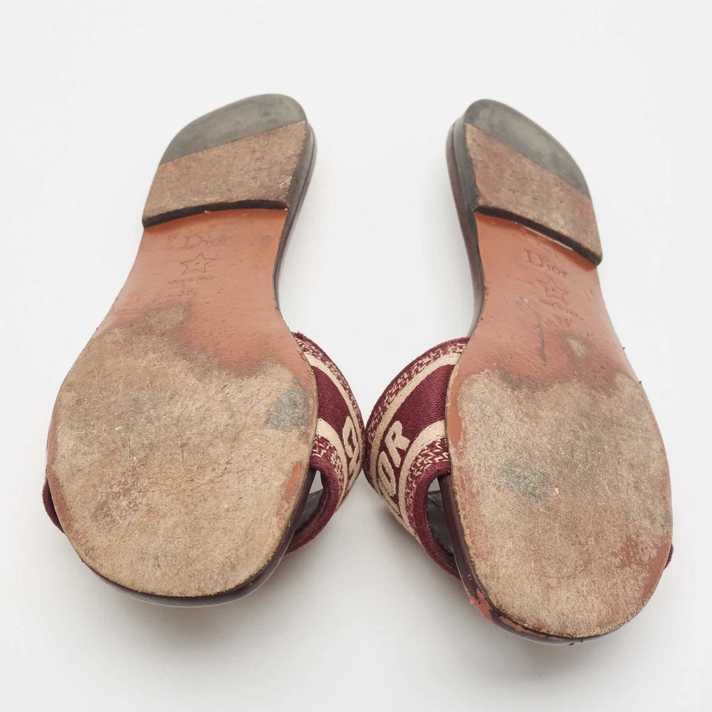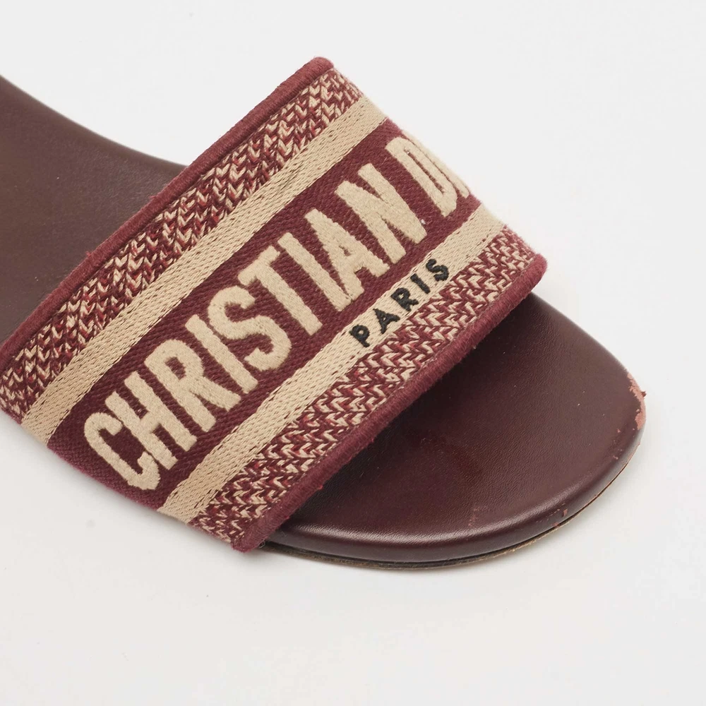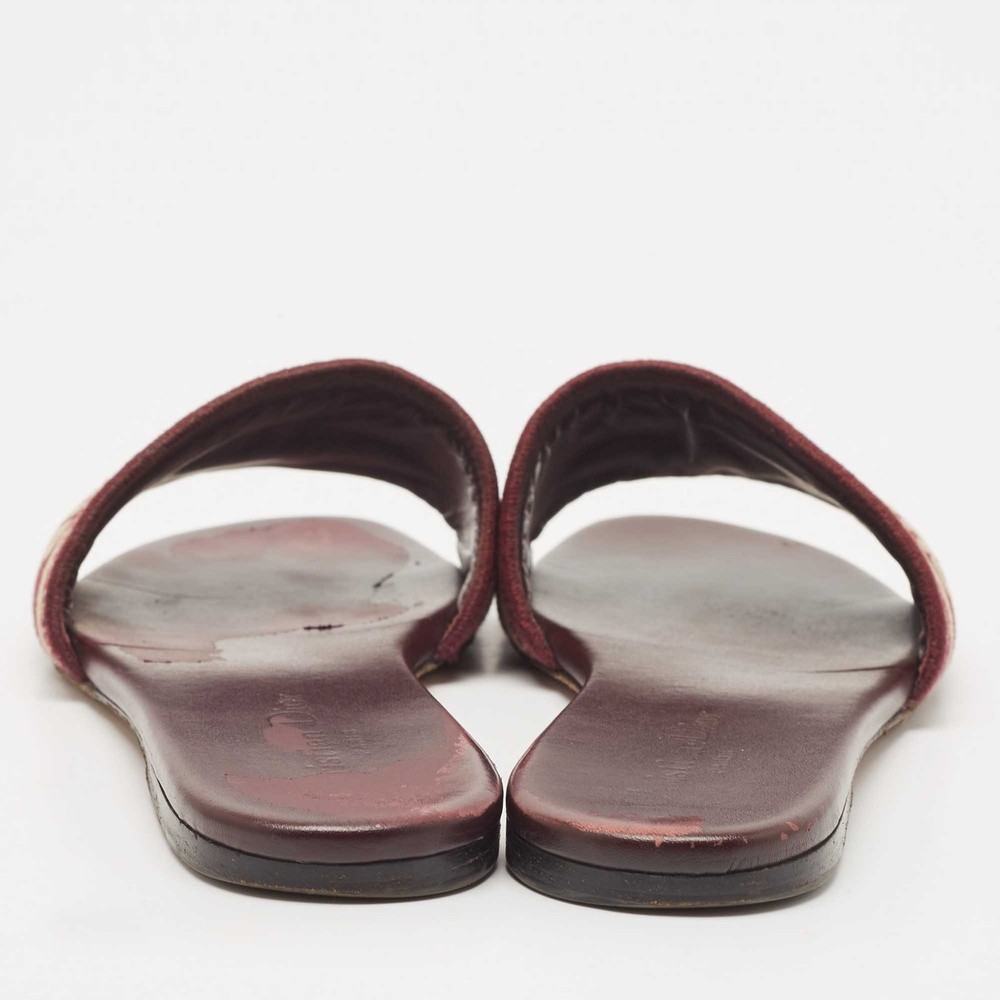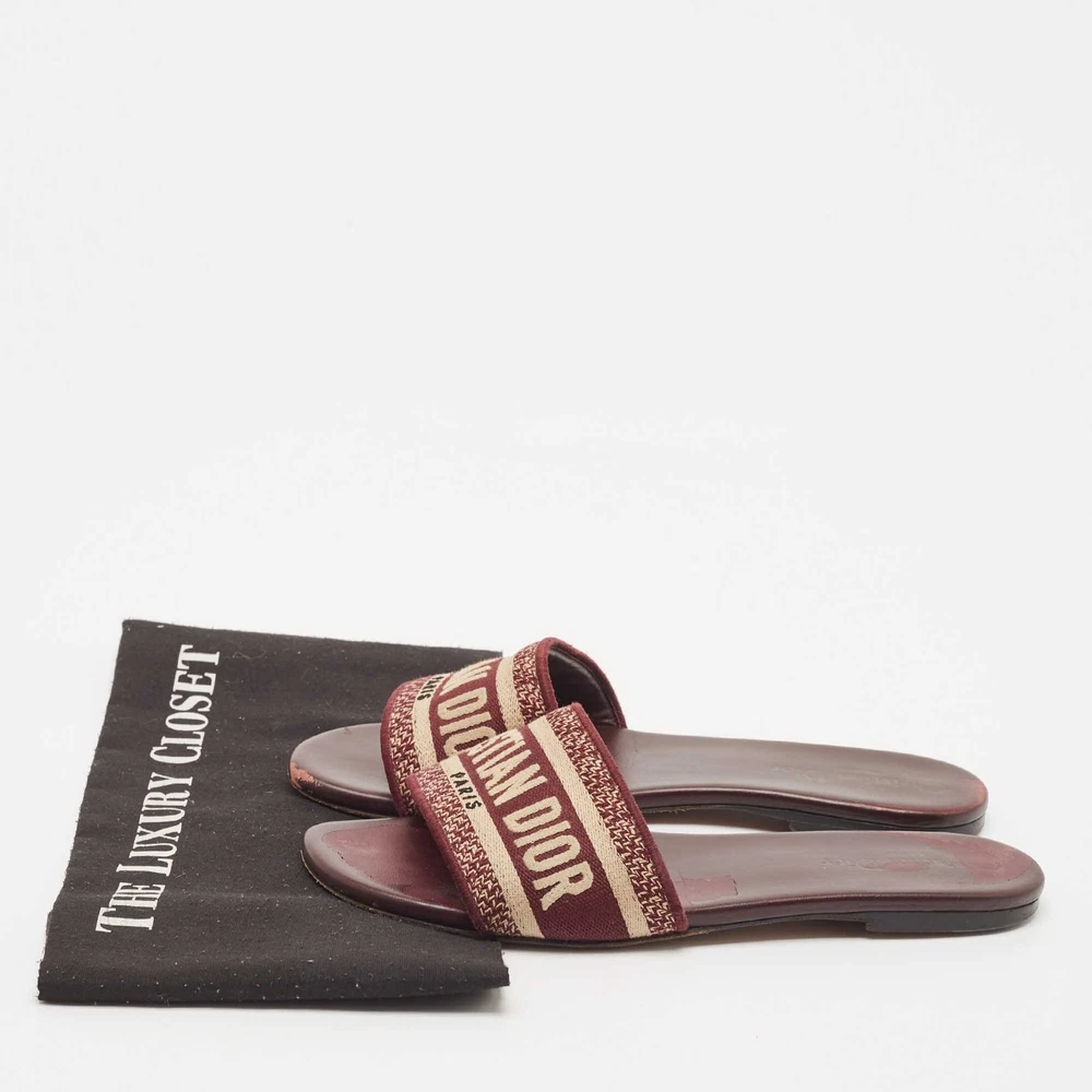 Enhance your casual looks with a touch of high style with these Dior slides. Rendered in quality material with a lovely hue adorning its expanse, this pair is a must haveCertified by The Luxury Closet - This item has gone through a detailed authentication process overseen by our experts. We offer a lifetime guarantee of authenticity on all our items. Import duties, taxes and charges are not included in the item price. These charges are the buyers responsibility. Please check with your country’s customs office to determine what these additional cost will be prior to buying. Our eBay Store About Us Contact Us Add to Favorite Sellers Dior Burgundy Embroidered Canvas Dway Flat Slides Size 38 $323.4 Enhance your casual looks with a touch of high style with these Dior slides. Rendered in quality material with a lovely hue adorning its expanse, this pair is a must have Product Details Brand Color Burgundy Dimensions Material Canvas Size 38 Outsole Width Outsole Length Heel Height Includes Certified by The Luxury Closet This item has gone through a detailed authentication process overseen by our experts. We offer a lifetime guarantee of authenticity on all our items. How We Check The in-house team of experts at The Luxury Closet is highly trained to verify the authenticity and the condition of the luxury products. They ensure that only 100% authentic items are put on sale.The evaluation process is unique with its own mix of assessment criteria and differs according to the category. Each item is evaluated based on the following combination of hallmarks, hardware, stitching, symmetry, material, craftsmanship, stamping, codes, hologram stickers, and packaging. Our authenticators also check if the items have been modified or amended (e.g., aftermarket diamonds, replaced batteries, repaired bags, etc.) International Buyers Import duties, taxes and charges are not included in the item price. These charges are the buyers responsibility. Please check with your country’s customs office to determine what these additional cost will be prior to buying.