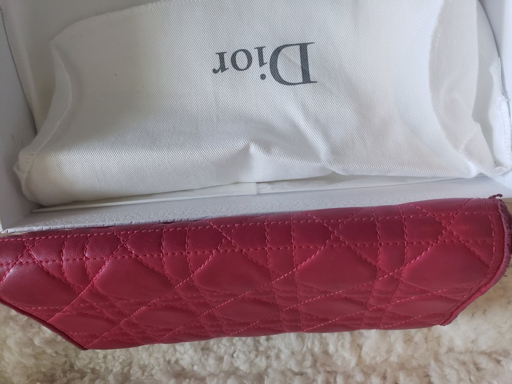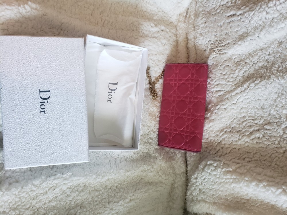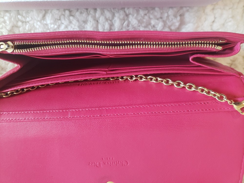 Pink Dior cannage wallet on chain. Includes box and dust bag. Some corner wear and rubbing on edges. Minor wear on the flap of the wallet and darkening on flap of the wallet. Interionr: Minor wear at bottom of wallet. Rank 6