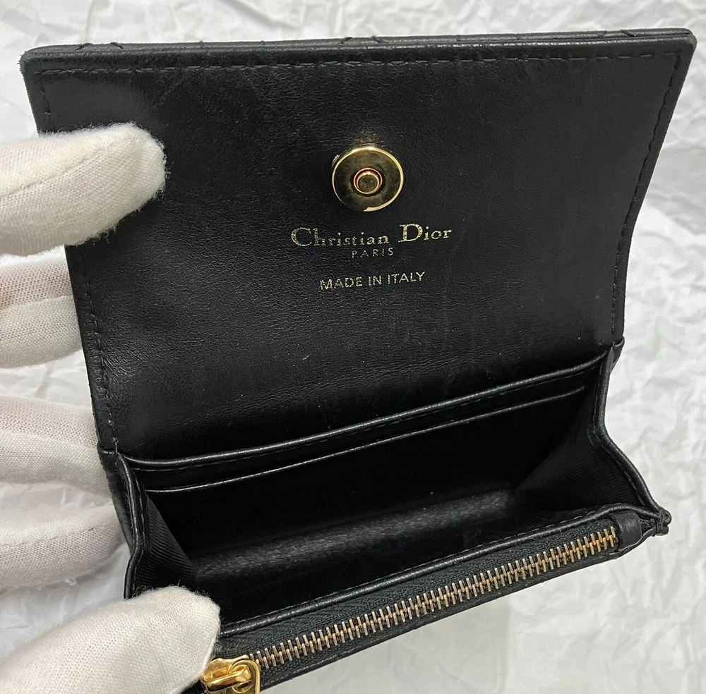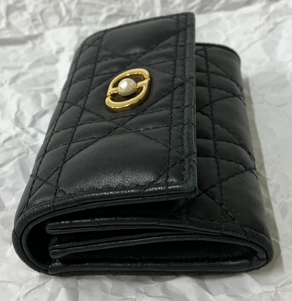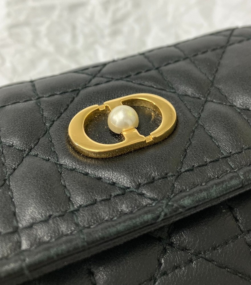 The inside of the bag is relatively clean and has only minor signs of wear and tear, few minor imperfections and little loss of shape. Size:W11xH7.5xD2.5cm 2 card pockets 1 gusset pocket 1 zipper coin purse Color: Black with gold hardware Materials: Leather (Cannage) and resin pearl Attachment: storage bag, box, paper tag, ribbon -------------------- This item has been authenticated as genuine by an authenticity agency. Secondhand dealer license No. 62111R061036 issued by Osaka Prefectural Public Safety Commission We are a fast and courteous transaction. I am a very happy customer. oh426070