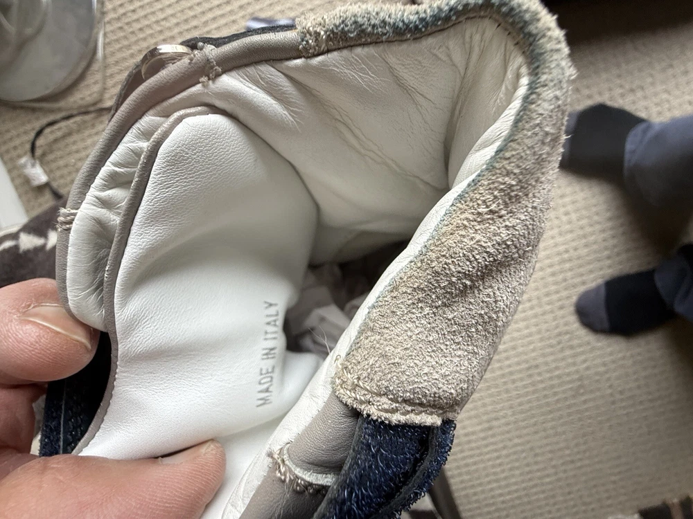 These are high-top sneakers by Christian Dior in gray leather suede. They feature a lace-up closure and a comfortable leather lining. The shoes are in size 45 (equivalent to US 12) and were made in Italy. The design is casual and stylish, suitable for everyday wear. some scuffs on leather and sole , minor dusting on rubber bottom. Velcro straps at top of shoes. please see pics, Free shipping to the US