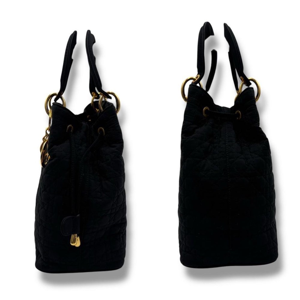 Christian Dior vintage Lady Dior handbag with DIOR logo charm, made in Italy, black quilting canage. This is a rare type that can be tightened like a drawstring at the top. There is some feeling of use as it is a vintage item, but there is no noticeable damage and the condition is good. Size: Approximately 9.84 inches wide x 9.45 inches tall x 5.12 inches deep. Handle: Approximately 11.81 inches. Color: Black. Accessories: None. Material: Nylon. I promise fast shipping via FedEx or DHL as soon as possible! Import duties, taxes and charges are not included in the item price or shipping charges. These charges are the buyer’s responsibility. These charges are normally collected by the delivering freight (shipping) company or when you pick the item up - do not confuse them for additional shipping charges.