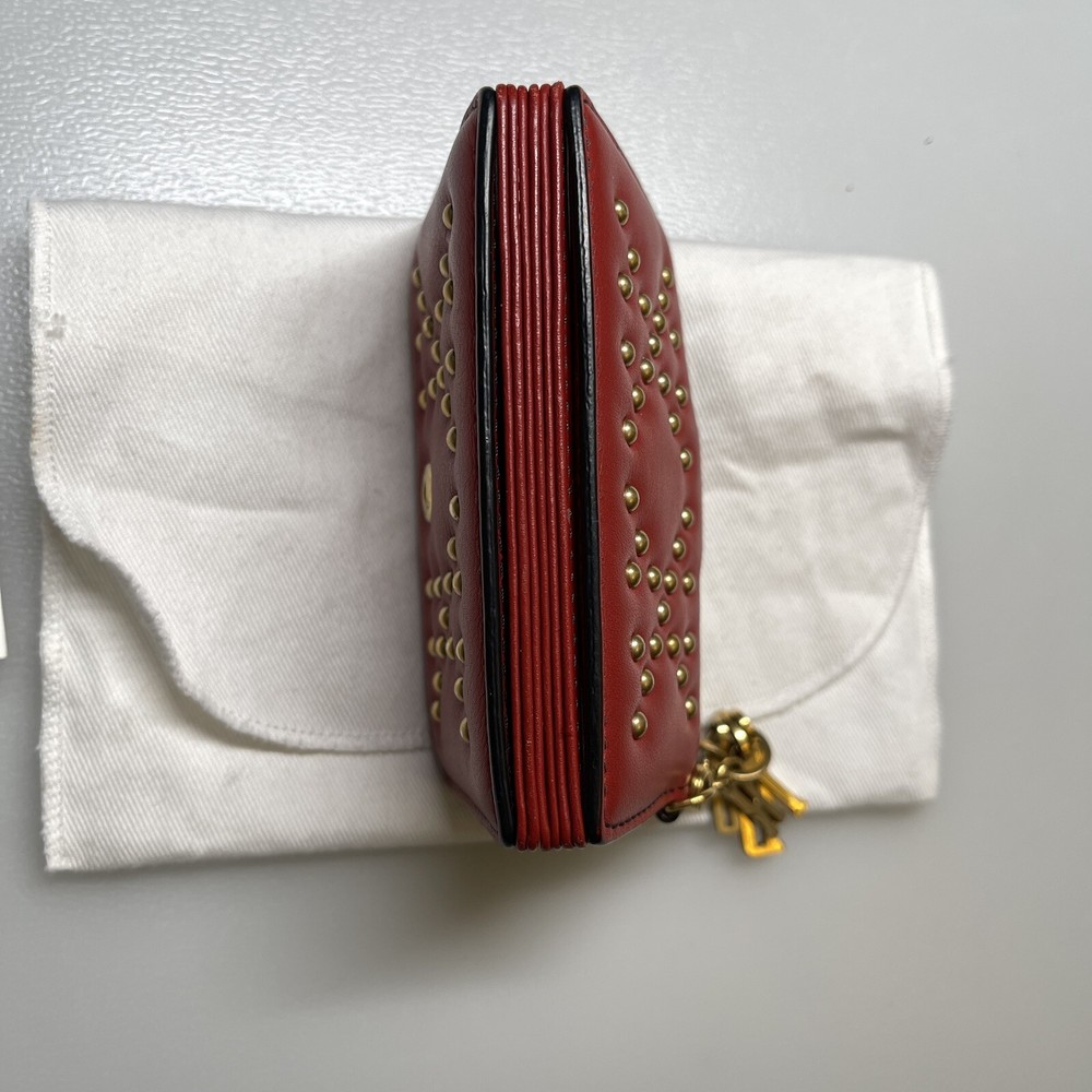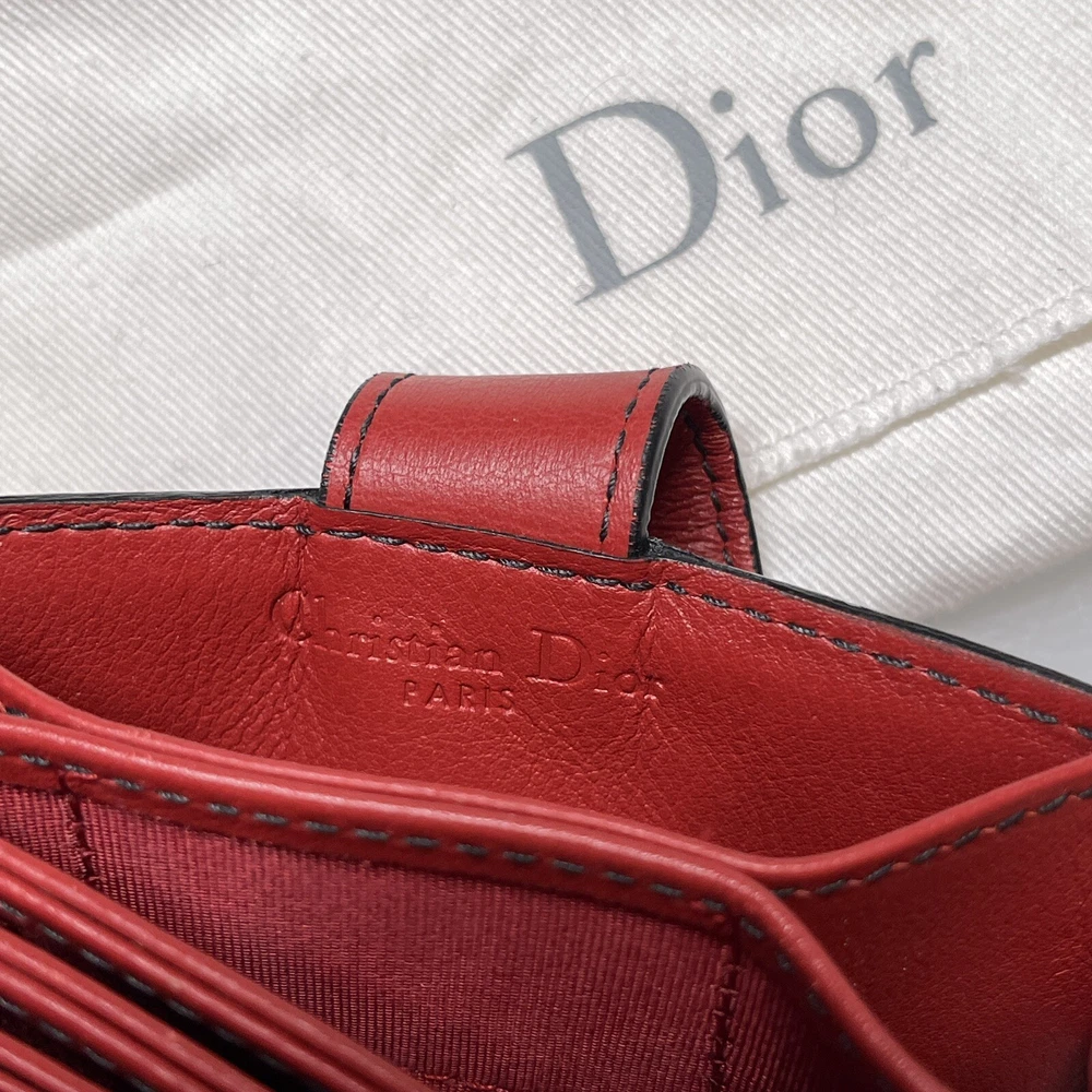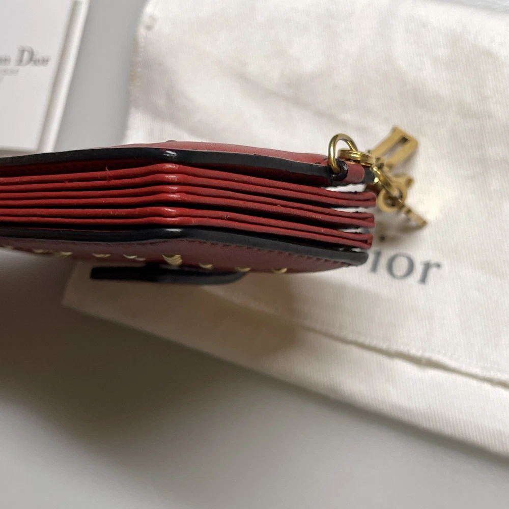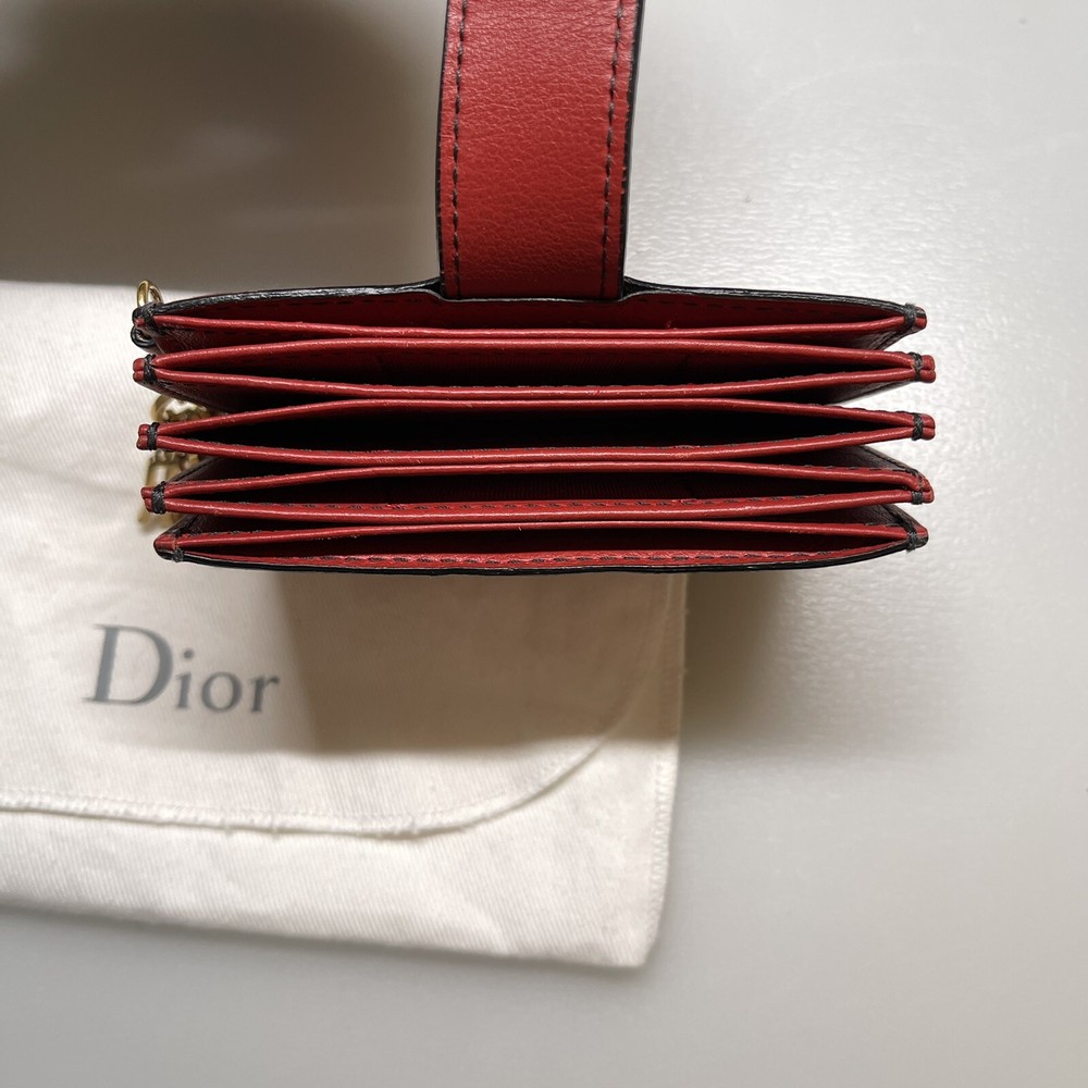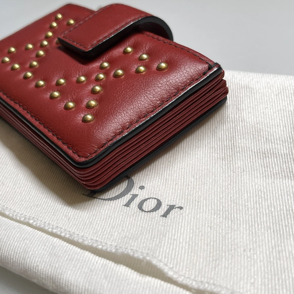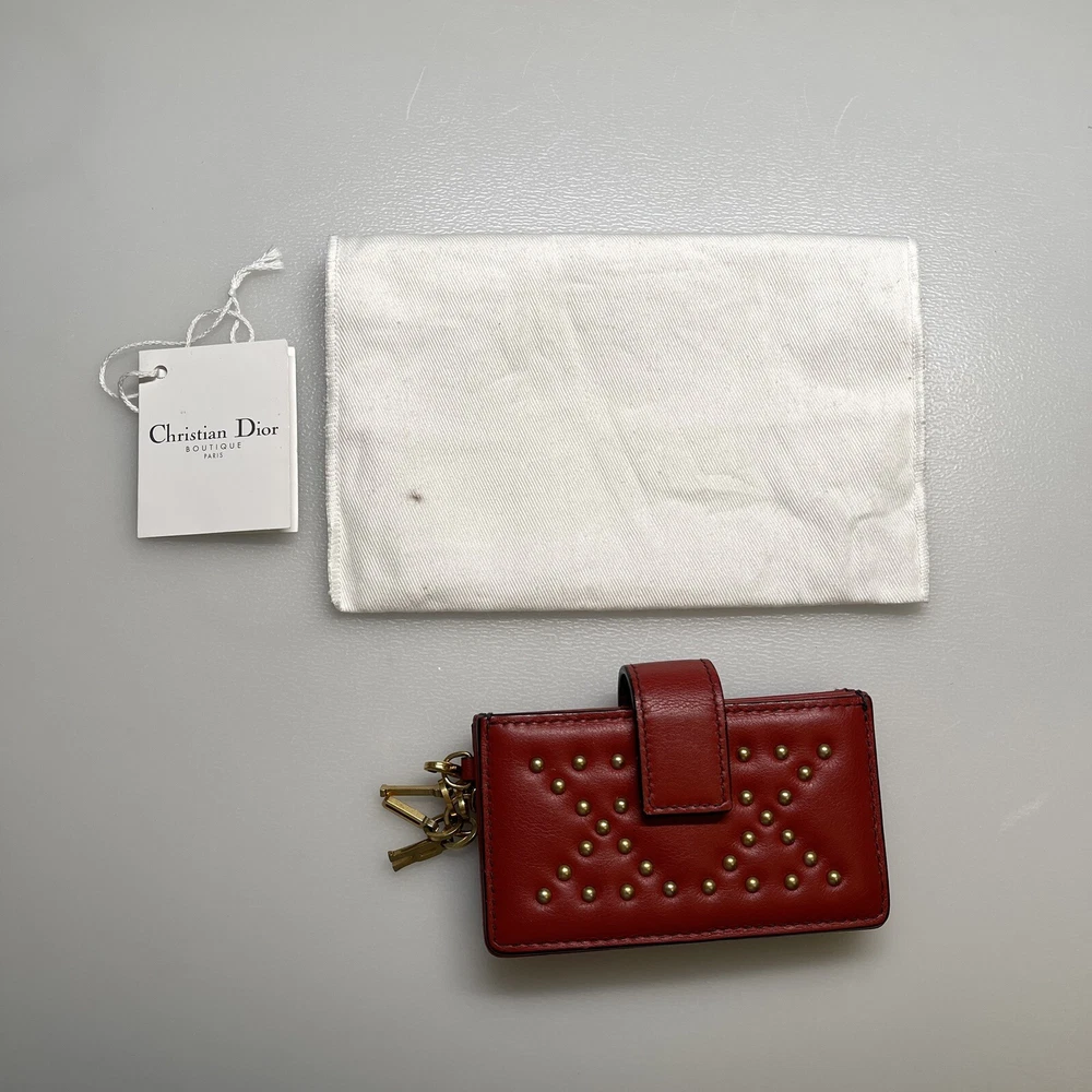 CHRISTIAN DIOR Lambskin Studded Cannage small Lady Dior 5 Card Holder wallet red Comes with tag and dust bag Has sign of use as shown Clean inside Overall still in very good condition Length: 4.25 in Height: 2.25 in Width: 0.75 in