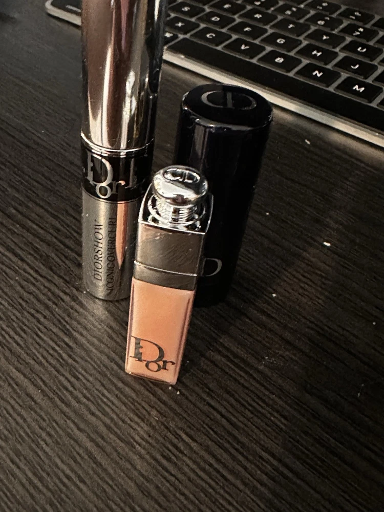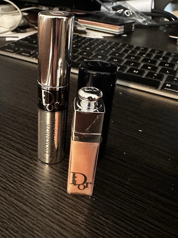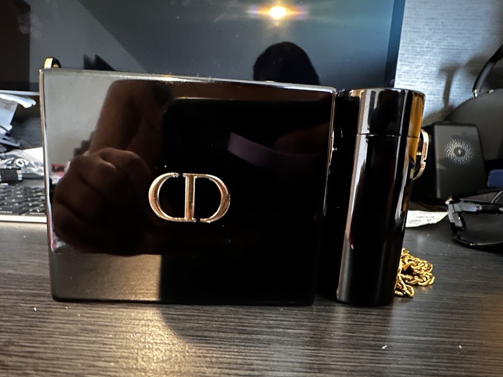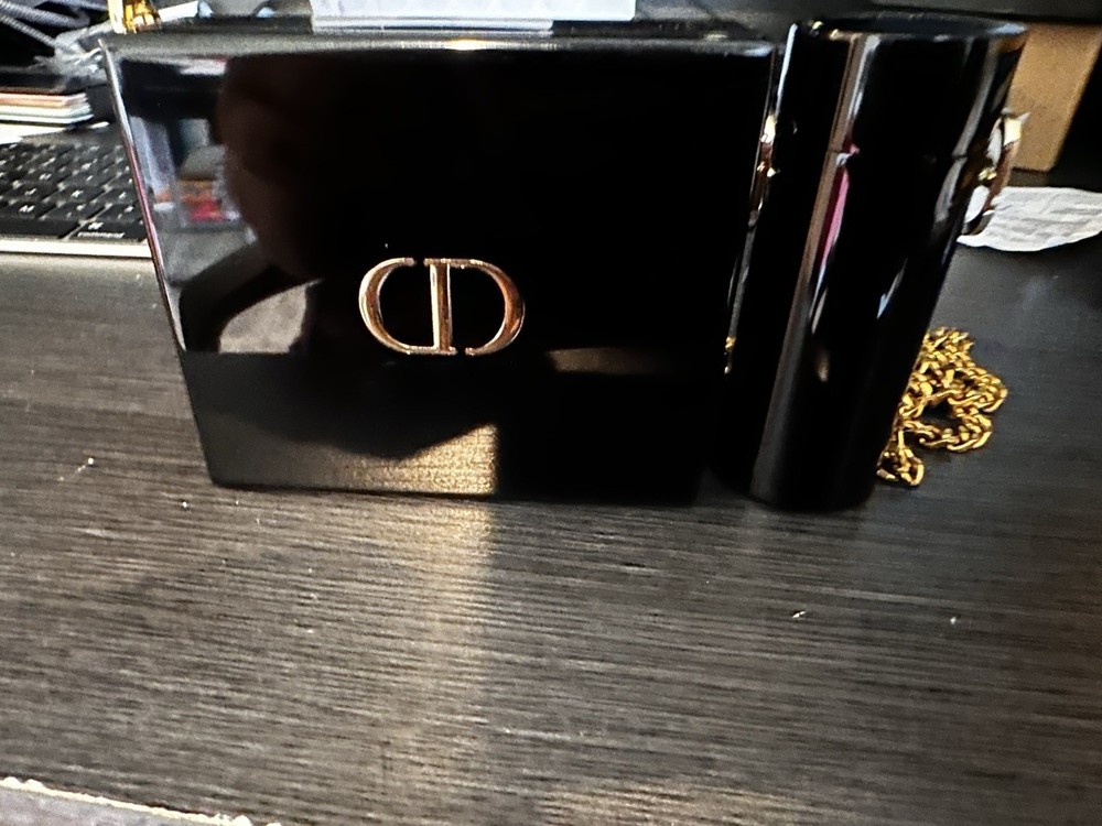 Dior lipstick purse with lipstick holder attachment. Can store travel sized items and credit cards. Comes with a mirror inside and includes a never worn travel mascara, lip plump and rouge Dior 471 lipstick in the color enchanted pink satin.