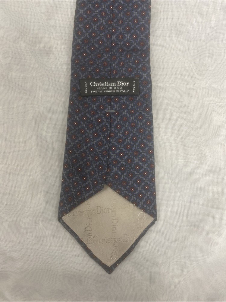 The Christian Dior Men's Blue Necktie with red and tan accents is a stylish accessory for men's formal wear. Made of 100% silk, this tie features a classic geometric pattern and a classic length of 57"-60". The multicolor design adds a touch of sophistication to any outfit, making it a versatile and fashionable choice for any occasion.