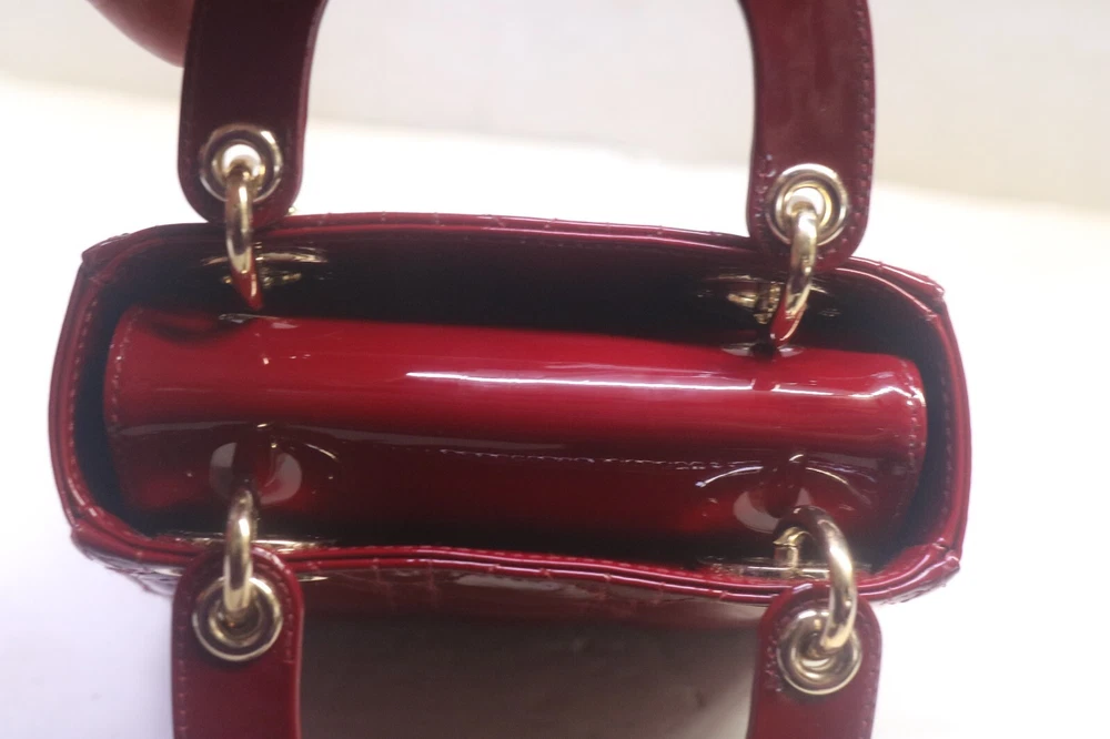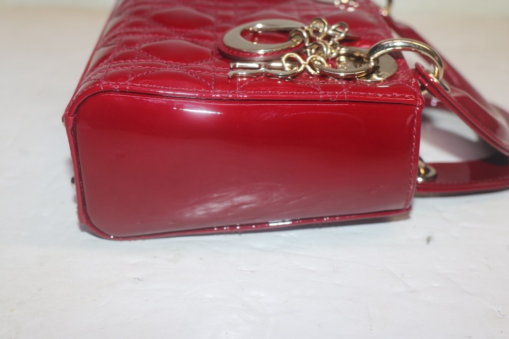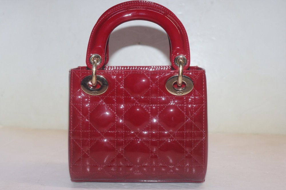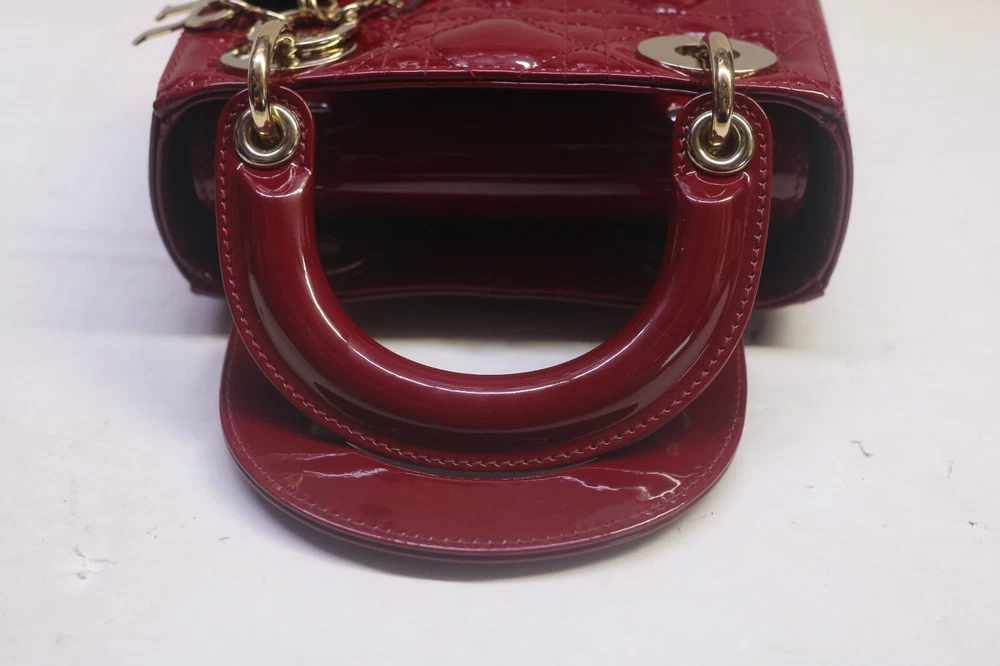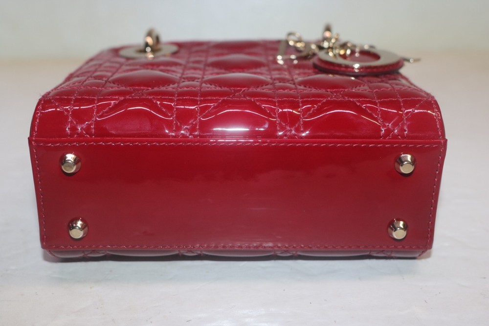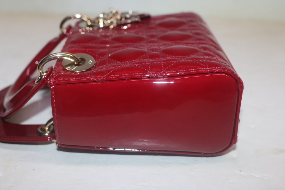 Christian Dior Patent Leather Cannage Mini Lady Dior Bag Red Designer: Christian Dior Material: Dark red cannage quilted patent leather Origin: Italy Date/Authenticity Code: D-0252 Measurements: 6.6" L x 3" W x 5.85" H Interior Pockets: One zip pocket Handles: Double flat rigid leather handles and single detachable chain link shoulder strap with leather pad Handle Drop: 2.5" and 22.5" Closure/Opening: Open top with leather flap Interior Lining: Fine textile lining Hardware: Goldtone