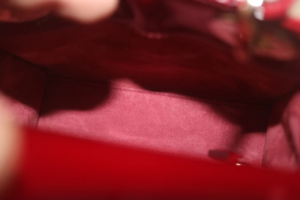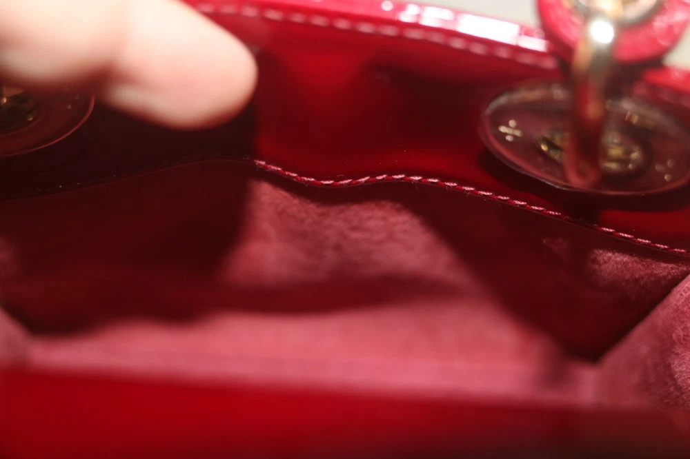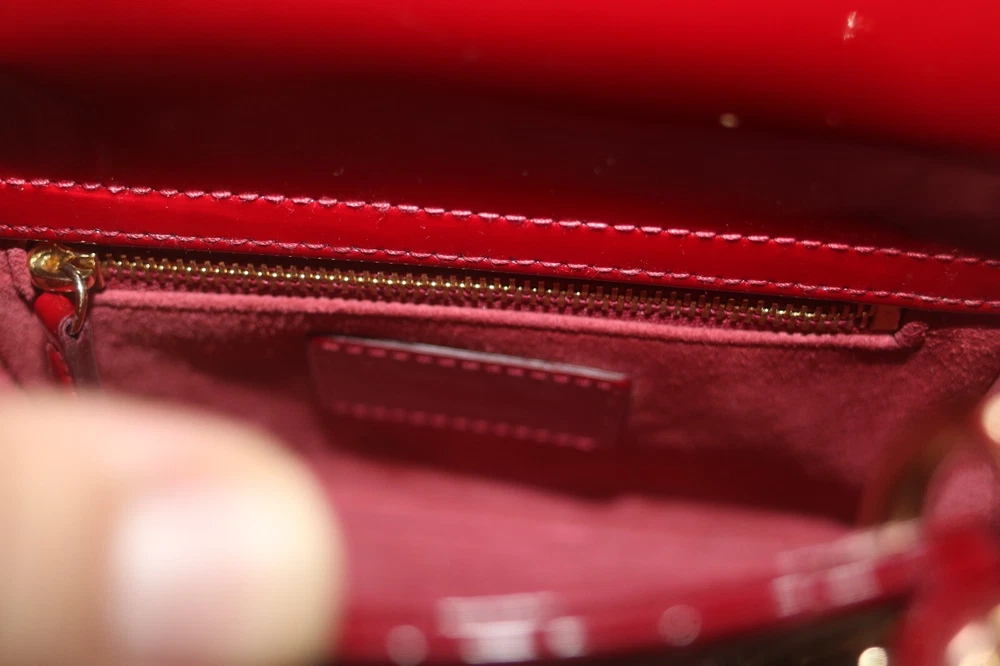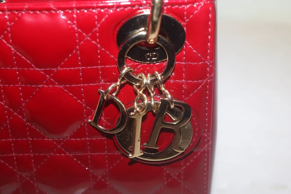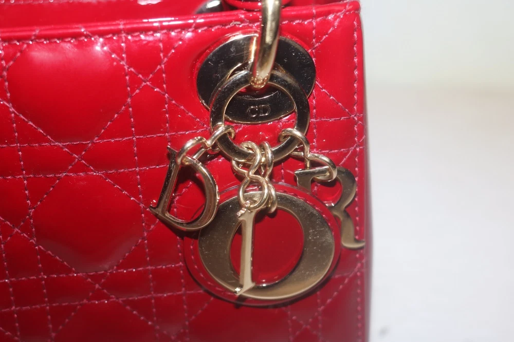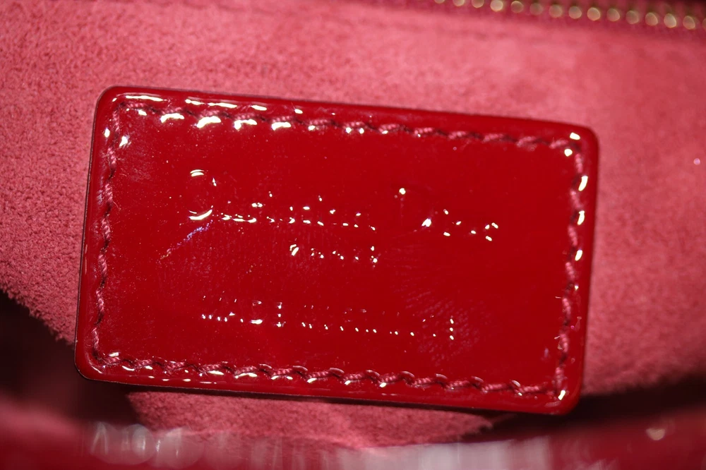 Christian Dior Patent Leather Cannage Mini Lady Dior Bag Red Designer: Christian Dior Material: Dark red cannage quilted patent leather Origin: Italy Date/Authenticity Code: D-0252 Measurements: 6.6" L x 3" W x 5.85" H Interior Pockets: One zip pocket Handles: Double flat rigid leather handles and single detachable chain link shoulder strap with leather pad Handle Drop: 2.5" and 22.5" Closure/Opening: Open top with leather flap Interior Lining: Fine textile lining Hardware: Goldtone