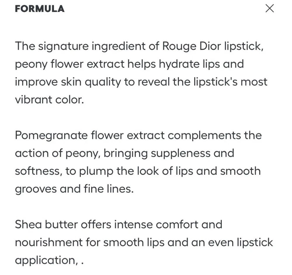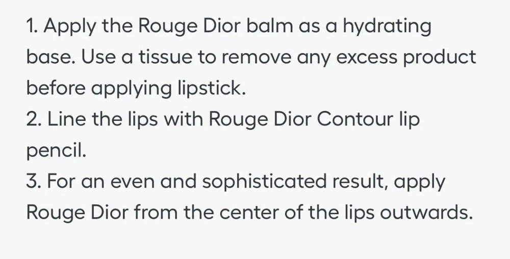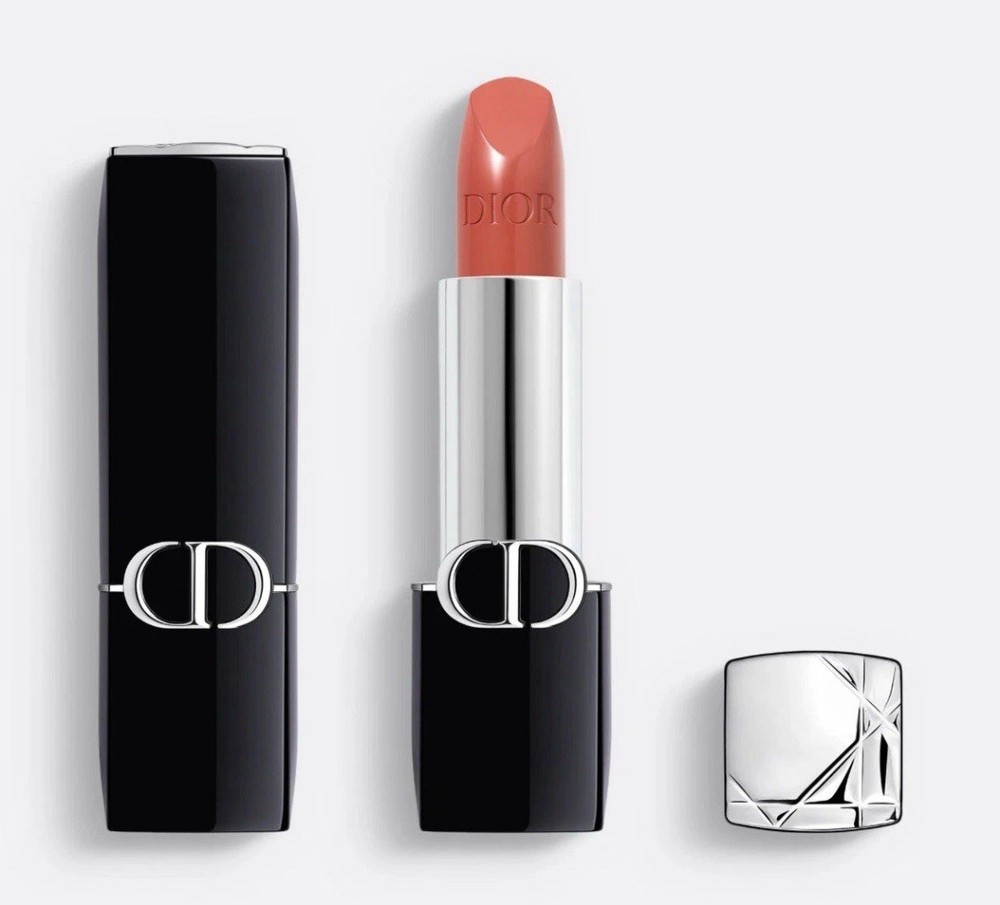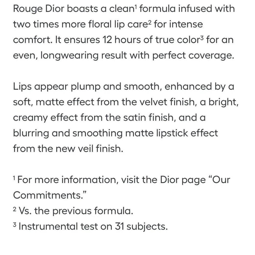 Dior Rouge Dior #434 Promenade Satin Finish Lipstick NIB + Dior Pouch. FORMULA The signature ingredient of Rouge Dior lipstick, peony flower extract helps hydrate lips and improve skin quality to reveal the lipstick's most vibrant color. Pomegranate flower extract complements the action of peony, bringing suppleness and softness, to plump the look of lips and smooth grooves and fine lines. Shea butter offers intense comfort and nourishment for smooth lips and an even lipstick application 1. Apply the Rouge Dior balm as a hydrating base. Use a tissue to remove any excess product before applying lipstick. 2. Line the lips with Rouge Dior Contour lip pencil. 3. For an even and sophisticated result, apply Rouge Dior from the center of the lips outwards. Rouge Dior boasts a clean' formula infused with two times more floral lip care? for intense comfort. It ensures 12 hours of true color for an even, longwearing result with perfect coverage. Lips appear plump and smooth, enhanced by a soft, matte effect from the velvet finish, a bright, creamy effect from the satin finish, and a blurring and smoothing matte lipstick effect from the new veil finish. ' For more information, visit the Dior page "Our Commitments. 2 Vs. the previous formula. 3 Instrumental test on 31 subjects.