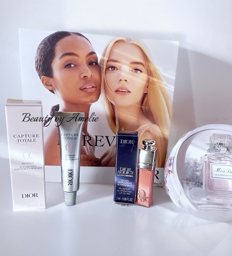 Dior Cosmetics Gift Set Dior Christian Dior Case & Beauty Travel Lip Gloss NEW travel sizes Dior lip, maximizer Gloss in rose nude (travel size) Blooming bouquet EDT Sample foundation Dior mascara Retishot