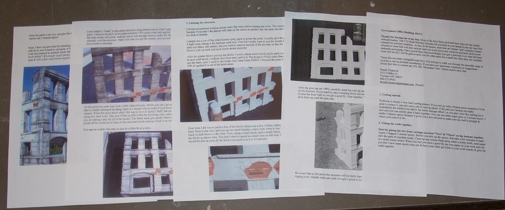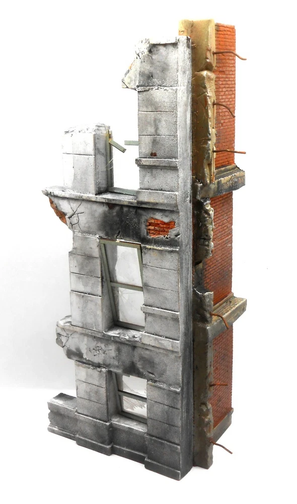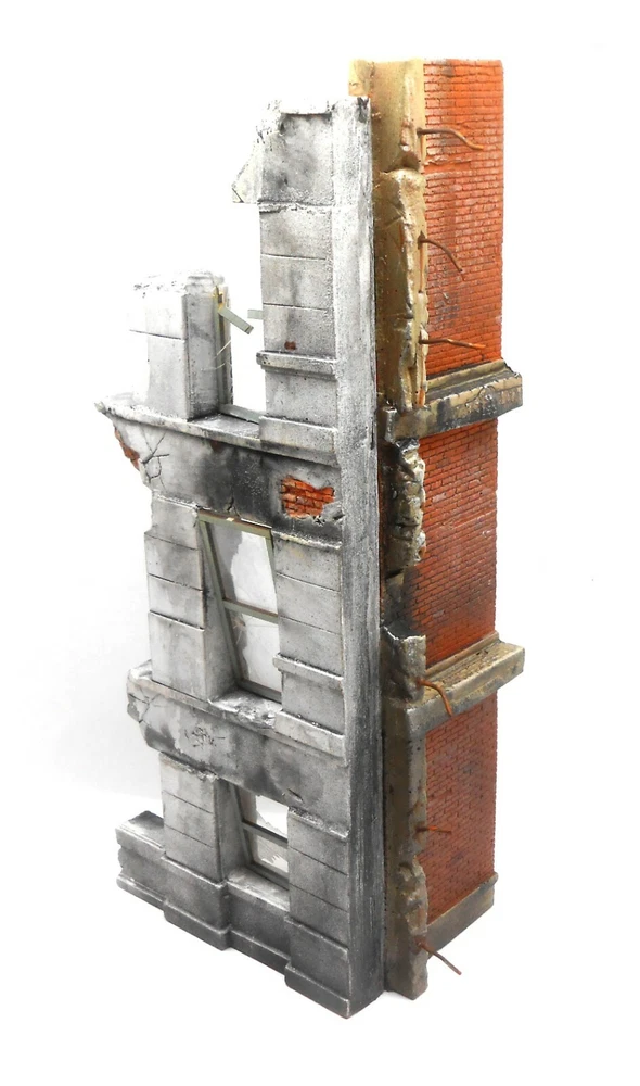 Number 6 in a new in a series of 1/35 Scale Architectural Ruins! Simple construction! Includes cast rubble & bricks, laser cut windows & "shattered" glass, rebar + complete, easy to understand assembly, painting & weathering instructions. 5" x 3" x 11" tall. The best kits you can buy for 3 reasons!! One. Attention to detail & realism. All of the original pattern work is hand carved by an artisan for maximum realism. This allows Dioramas Plus kits to include details you'll never find in other kits. Missing and chipped bricks, "ghost' staircases and walls, crumbling stucco and cracked and weathered concrete. If you can find it in real life you'll see it in a Dioramas Plus kit! Two. Ease of construction. We try & keep the kits simple so you can get to the fun part (painting & weathering the buildings) in about 15 minutes. Our instructions are second to none, with complete, easy to understand instructions that walk you through each and every step along the way, from basic assembly to painting & weathering the model. Three. Customer service. Got a question about weathering your model? Give us a call. End up with a broken part somehow? We'll replace the parts for free. Paint your first hydrocal kit & you're unhappy with the way it came out? Drop us an email & we'll send you a second set of castings so that you can try again. Why do we do this? Because we want you to have fun with our kits and to be happy with your finished results. If you need anything at all touch base with us & we'll help you out. Our customer service is second to none. 100% positive feedback! Here is an unsolicited comment from a customer that just built his first Dioramas Plus kit; "Just finished constructing your "Brick Ruins". This is by far the best kit I have ever purchased from anybody. Since I built one of your buildings I of course have ********** and ******** buildings in mind as a comparison, since they are your only real competition. Reasons for putting you above all others? Good price. Perfect shipping and amazing effort to pack the model so it is not broken during delivery. Real genuine accuracy as to scale. Next, your attention to detail is outstanding, and the kit was complete (many other mfg's kits are missing pieces) and easy to assemble because all the parts are present and they all fit together. I personally have built but intensely dislike vacuform building kits since none of the parts fit without serious modifications."Bob H. Check out the sample pictures of our detailed, yet easy to understand full color illustrated instructions. Our customers tell us they are the best in the business. We want you to be able to build as nice of a model as the one you see on the box cover. Instructions shown are samples, the ones you receive with your kit are written and illustrated specifically for it. The reason customers call these the best diorama kits available is because they combine amazing, contest quality detail with super easy construction. All of the master patterns were hand created by a master X Hollywood Scenic artist and are detailed right down to the bullet holes in the stucco. Unlike finicky vaccuform kits which require you to glue numerous thin plastic walls together, spackle or patch the seams and then try to paint the slick plastic to look like masonry, these Dioramas Plus kit usually just feature 3 or 4 precast sections that can be glued together in about 15 minutes so you can move on to the fun part, painting & detailing your diorama. Since the parts are cast hydrocal ( a very hard casting plaster) it's incredibly easy to get a realistic finish to your model. Complete, full color instructions (see photos of sample instructions above) walk you through step by step of the building & painting process, and if that weren't enough, you are more than welcome to contact me via email or phone if you have any questions or problems, as I love to see people have fun with our kits and get good results. All pictures are of actual model! Amazing, contest quality detail!! ITEM COMES UNASSEMBLED AND UNPAINTED