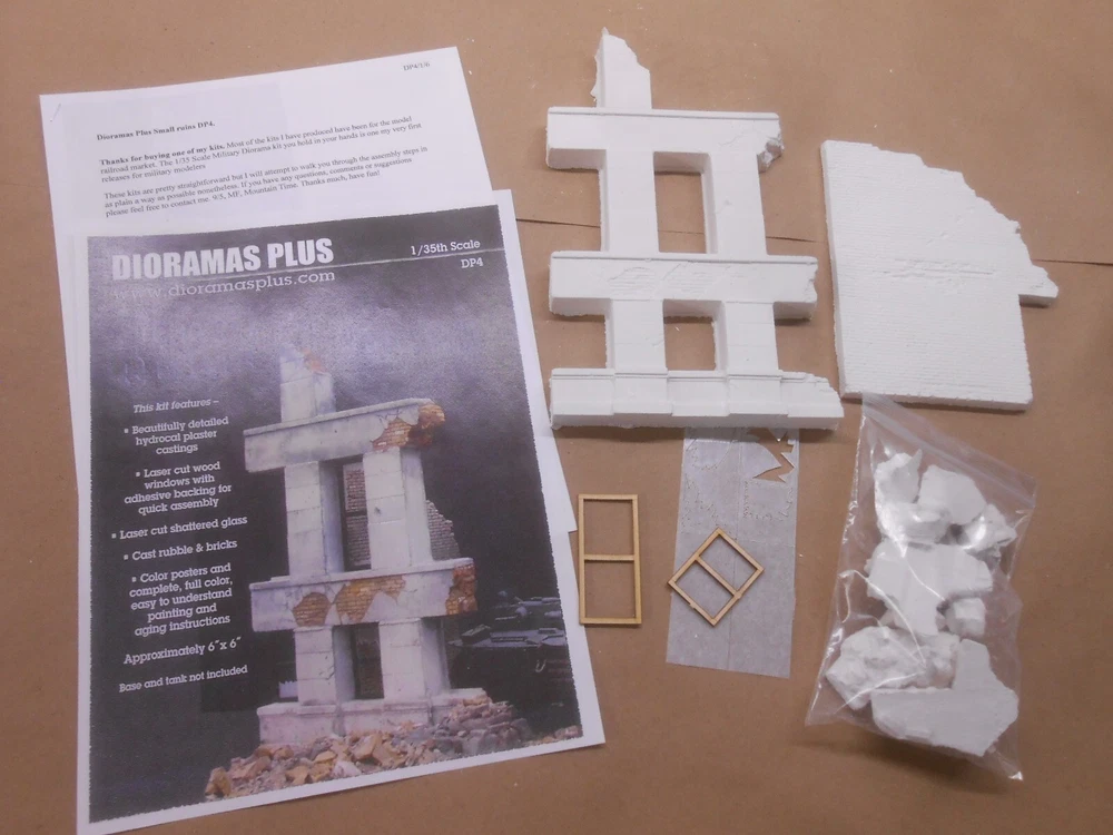 NIB, shrink wrapped kit. The best kits you can buy for 3 reasons!! One. Attention to detail & realism. All of the original pattern work is hand carved by an artisan for maximum realism. This allows Dioramas Plus kits to include details you'll never find in other kits. Missing and chipped bricks, "ghost' staircases and walls, crumbling stucco and cracked and weathered concrete. If you can find it in real life you'll see it in a Dioramas Plus kit! Two. Ease of construction. We try & keep the kits simple so you can get to the fun part (painting & weathering the buildings) in about 15 minutes. Our instructions are second to none, with complete, easy to understand instructions that walk you through each and every step along the way, from basic assembly to painting & weathering the model. Three. Customer service. Got a question about weathering your model? Give us a call. End up with a broken part somehow? We'll replace the parts for free. Paint your first hydrocal kit & you're unhappy with the way it came out? Drop us an email & we'll send you a second set of castings so that you can try again. Why do we do this? Because we want you to have fun with our kits and to be happy with your finished results. If you need anything at all touch base with us & we'll help you out. Our customer service is second to none. 100% positive feedback! Here is an unsolicited comment from a customer that just built his first Dioramas Plus kit; "Just finished constructing your "Brick Ruins". This is by far the best kit I have ever purchased from anybody. Since I built one of your buildings I of course have ********** and ******** buildings in mind as a comparison, since they are your only real competition. Reasons for putting you above all others? Good price. Perfect shipping and amazing effort to pack the model so it is not broken during delivery. Real genuine accuracy as to scale. Next, your attention to detail is outstanding, and the kit was complete (many other mfg's kits are missing pieces) and easy to assemble because all the parts are present and they all fit together. I personally have built but intensely dislike vacuform building kits since none of the parts fit without serious modifications."Bob H. Check out the sample pictures of our detailed, yet easy to understand full color illustrated instructions. Our customers tell us they are the best in the business. We want you to be able to build as nice of a model as the one you see on the box cover. Instructions shown are samples, the ones you receive with your kit are written and illustrated specifically for it. The reason customers call these the best diorama kits available is because they combine amazing, contest quality detail with super easy construction. All of the master patterns were hand created by a master X Hollywood Scenic artist and are detailed right down to the bullet holes in the stucco. Unlike finicky vaccuform kits which require you to glue numerous thin plastic walls together, spackle or patch the seams and then try to paint the slick plastic to look like masonry, these Dioramas Plus kit usually just feature 3 or 4 precast sections that can be glued together in about 15 minutes so you can move on to the fun part, painting & detailing your diorama. Since the parts are cast hydrocal ( a very hard casting plaster) it's incredibly easy to get a realistic finish to your model. Complete, full color instructions (see photos of sample instructions above) walk you through step by step of the building & painting process, and if that weren't enough, you are more than welcome to contact me via email or phone if you have any questions or problems, as I love to see people have fun with our kits and get good results. DIORAMAS PLUS MODEL kit COMPLETE, FULL COLOR, EASY TO UNDERSTAND PAINTING AND AGING INSTRUCTIONS ITEM COMES UNASSEMBLED AND UNPAINTED