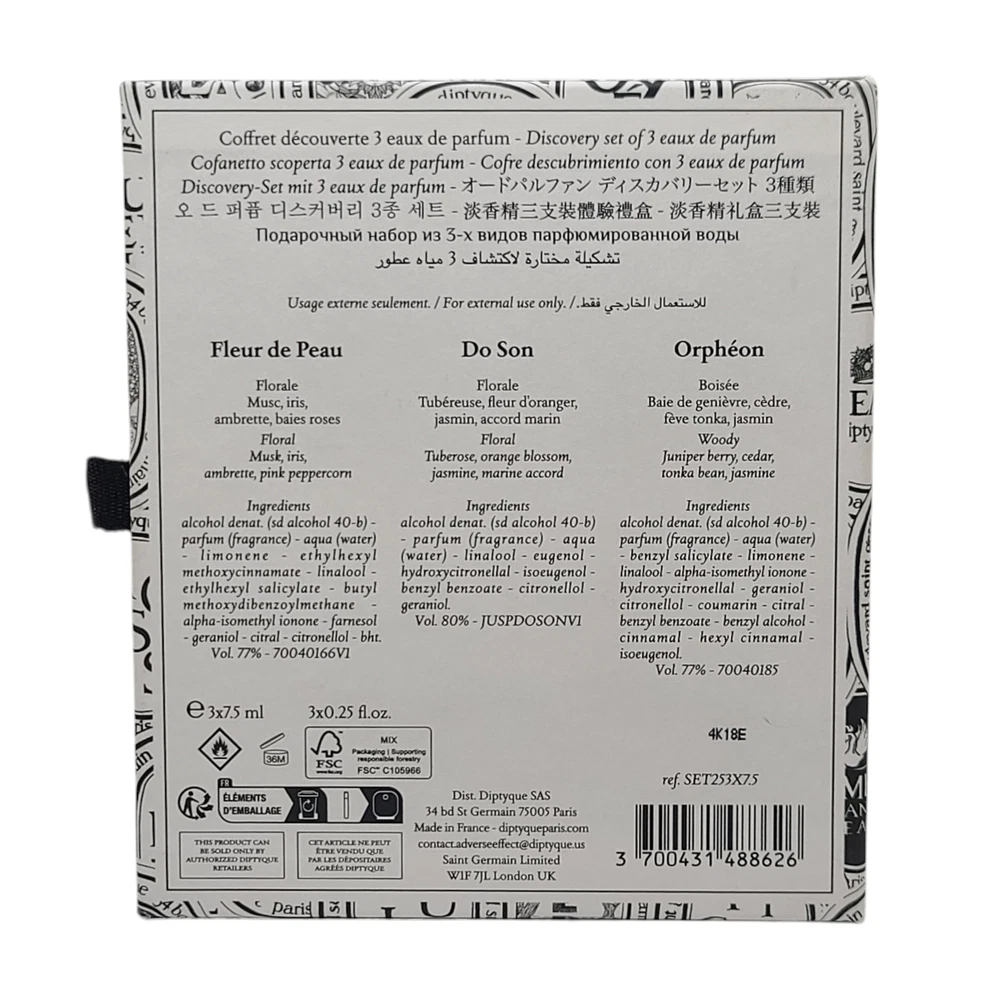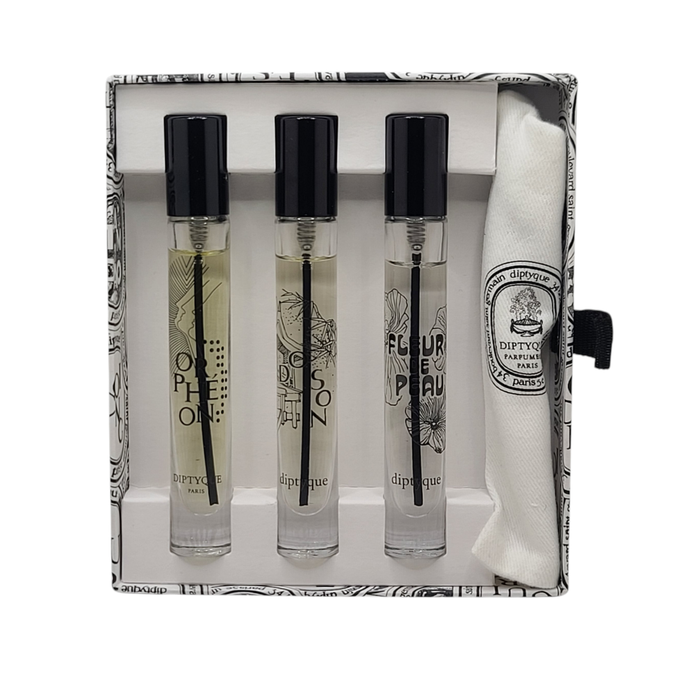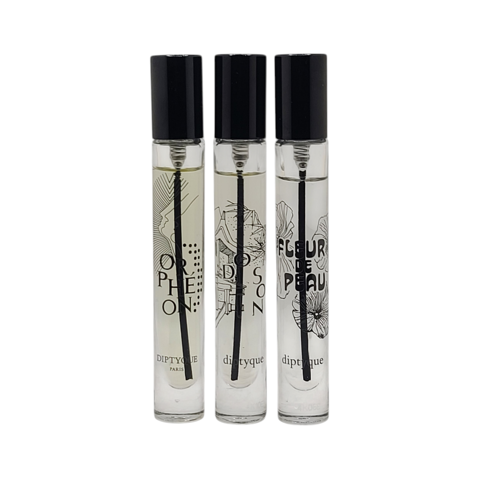 KleverKosmetics Our eBay Store About Us Contact Us Add to Favorite Sellers Diptyque Discovery Set Of 3 Eau de Parfum 0.25oz Each See *Description* ** This 3 Piece Discovery Set is Not Full. The lowest amount is 85 percent full. Comes with original box and travel bag. You will receive what is pictured. ** The Diptyque Eau de Parfum Discovery Set featuring Do Son, Fleur de Peau, and Orphéon is a travel-friendly collection designed to showcase the Maison\'s most iconic Eau de Parfums. This specific 3-piece set is curated to provide a range of olfactory profiles, from floral and musky to woody. Presentation: Packaged in a signature Diptyque gift box, including a small fabric travel pouch. Size: This sets contain three 7.5ml (0.25 fl oz) mini sprays, not all are full. Please refer to pictures. Orphéon (Eau de Parfum): A woody and fresh fragrance with cedar, tonka bean, and juniper berries. Fleur de Peau (Eau de Parfum): A tribute to musk, featuring notes of iris, ambrette, and pink peppercorn. Do Son (Eau de Parfum): A tuberose-forward floral scent with notes of jasmine, orange blossom, and amberwood. Return and Refund Information • Please be aware that colors on the screen may appear slightly different in person. • Please be familiar with product. Feel free to contact us if you have any questions. • DUE TO HEALTH AND SANITARY ISSUES CONCERNING COSMETICS OR SKINCARE WE DO NOT ACCEPT RETURNS ON THESE ITEMS. ALL SALES ARE FINAL. • WE WILL ONLY ACCEPT RETURNS WHEN THE ERROR IS ON OUR END. • Attention VeRO members: We're not affiliated with or endorsed by the companies mentioned in this listing. All trademarks and copyrights are acknowledged, they are only used for informative description of the items offered for sale. Warranty information We are not an authorized dealer of this product and any warranty included with the product may not be honored by the manufacturer.