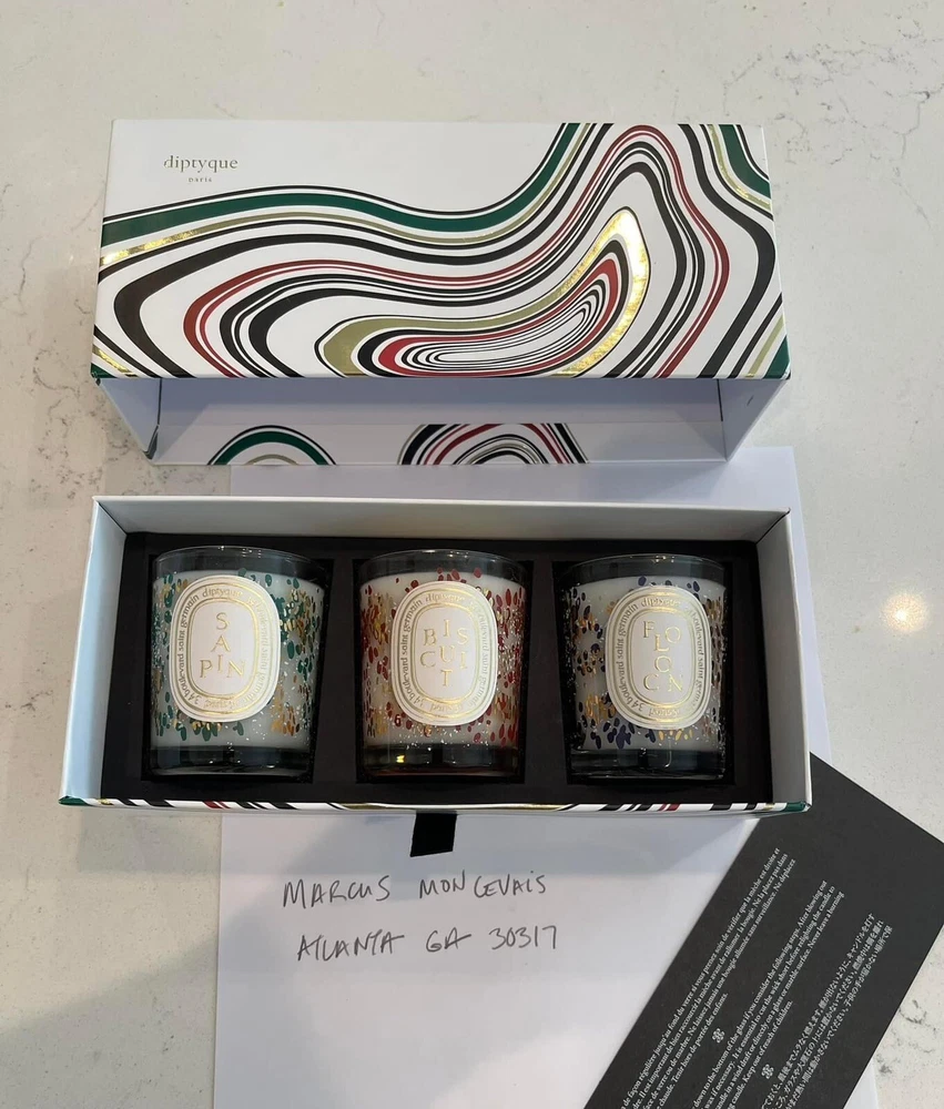 Diptyque 2021 Holiday Small Candle Set * Set Includes: Sapin Scented Candle 70g, Biscuit Scented Candle 70g, and Flocon Scented Candle 70g * Sapin candle features the scents of fresh, mountain pines with the fragrance of an open fire * Biscuit candle features spicy notes of holiday desserts with patchouli * Flocon candle features white musks blended with the winter flower, mimosa * Size: 2.4 oz / 70 g x 3 Opened but never burned. Please reach out with any questions, thanks for looking!