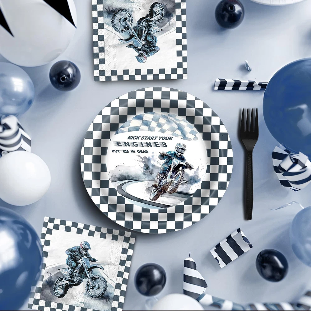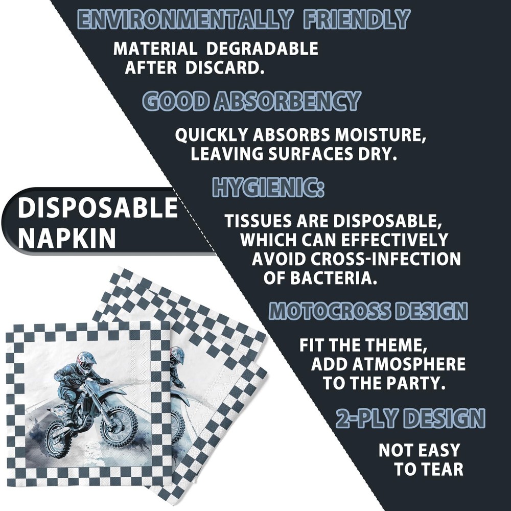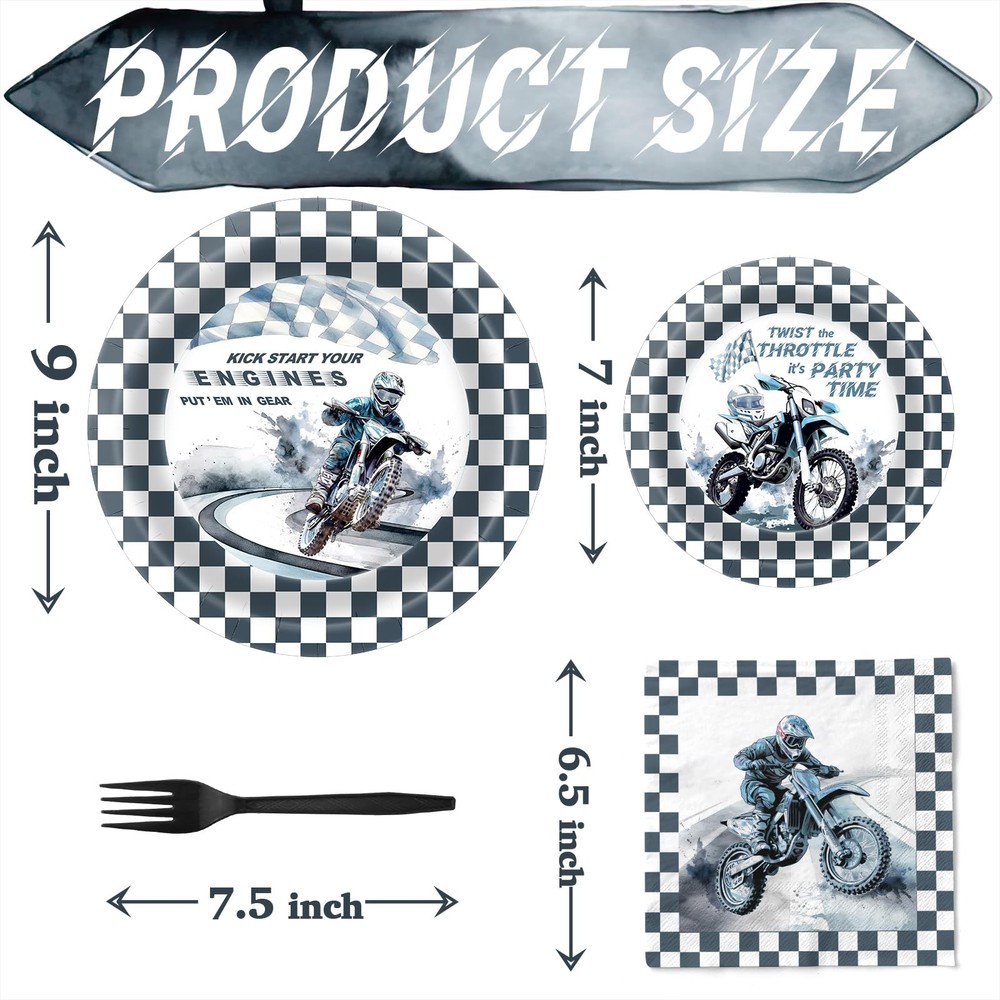 Dirt Bike Party Plates and Napkins - Dirt Bike Party Decorations - Dirt Bike Party Tableware - Dirt Bike Party Favors - Dirt Bike Party Supplies Serves 20 Guests Comprehensive Dirt Bike Tableware Set: Our Dirt Bike party decorations package includes everything you need to serve 20 guests. It features 20 dirt bike party paper dinner plates (9''), 20 dessert plates (7''), 20 cool dirt bike-themed napkins (6.5''), and 20 sets of sturdy plastic forks. This complete party kit ensures a seamless and exciting dining experience. Premium Quality Assurance: Crafted from high-quality paper, our dirt bike decor plates and napkins are not only visually striking but also non-toxic, odorless, and incredibly durable. The vibrant dirt bike patterns and colors are fade-resistant, creating an energetic and adventurous atmosphere for your event. Exciting Dirt Bike Decor: Bring the thrill of motocross to your party with dynamic dirt bike-themed decorations. Each item is designed to capture the fast-paced spirit of motocross, adding energy and excitement to your celebration. Kids and adults alike will be captivated by the bold dirt bike graphics, filling your event with fun and anticipation. Effortless Enjoyment: Hosting a memorable dirt bike-themed party has never been easier. Our thoughtfully arranged party set allows you to focus on celebrating with friends and family, as post-party cleanup is quick and hassle-free. Enjoy every moment without the worry of extensive cleanup afterward. Versatile Event Appeal: Whether it's a birthday, motocross-themed gathering, or any other special occasion, our dirt bike-themed party supplies are versatile and perfect for a range of events. Give your guests an unforgettable experience with this lively dirt bike party ensemble, making your celebration a standout event.