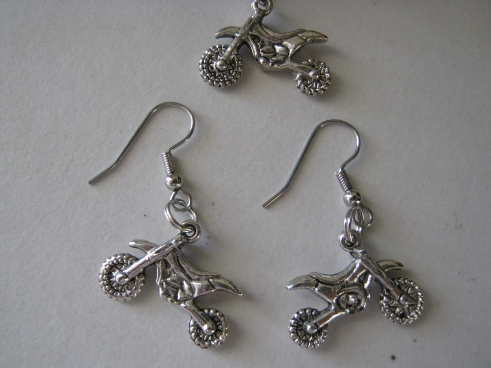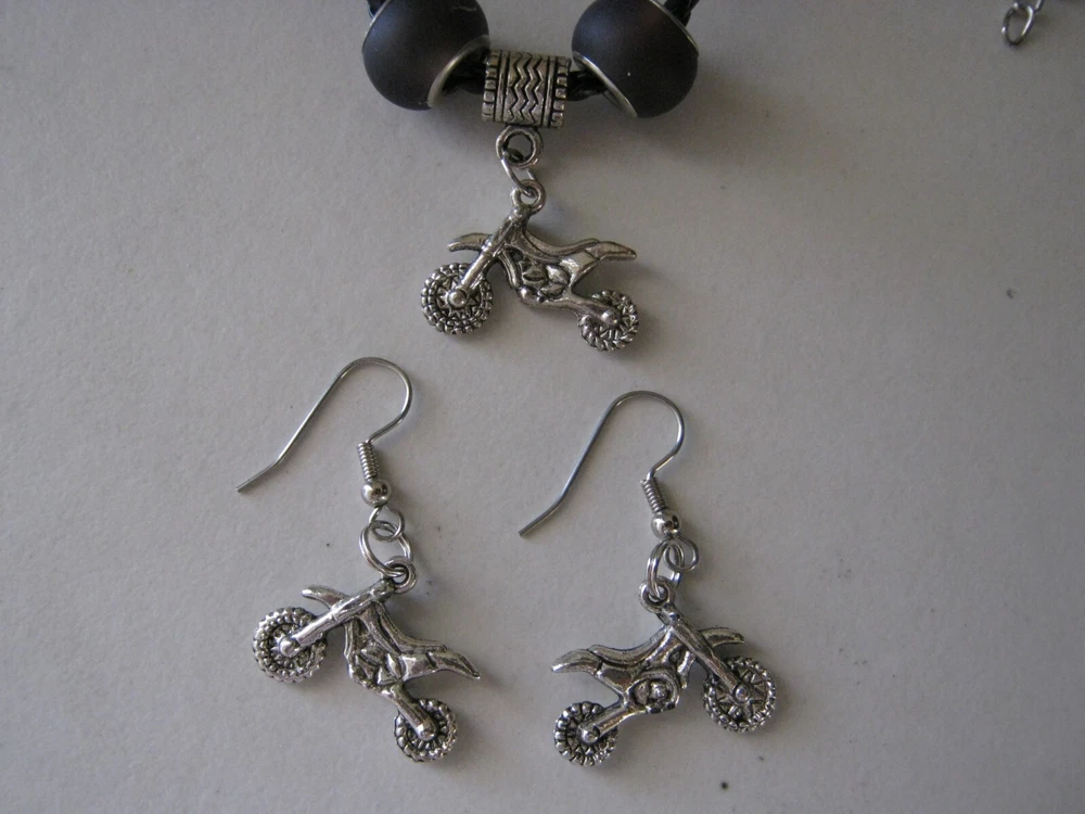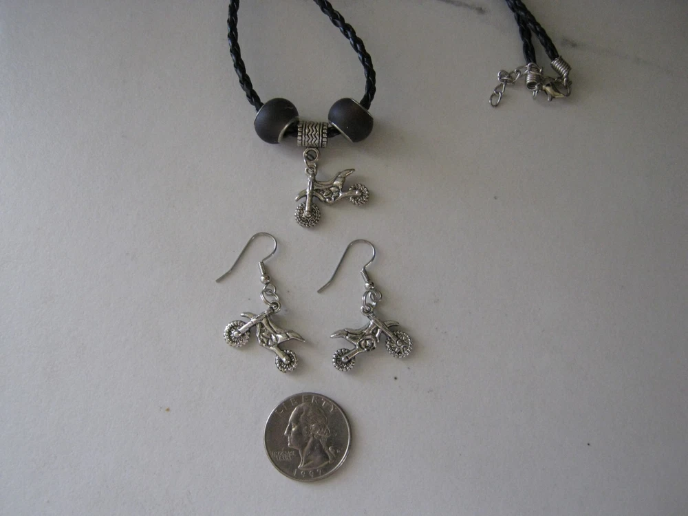 Show your a fan of Off Roading and MOTO CROSS to your style with this handmade Dirt Bike Motorcycle Necklace and Earrings Set. The necklace is Braided Black leatherlike and I added 2 spacer beads nothing flowery or bright colorful, just tastefully coordination with the Moto Cross Bike charms. Enjoy the Dirt, Fast fun Action, the Thrill of the Track or Trail? Then these are just right for you or someone you know. Check other items I have available there may be something else of interest to you or someone you know. FREE SHIPPING makes this a great deal. Happy Bidding and Enjoy. USA SHIPPING ADDRESSES ONLY NO INTERNATIONAL SHIPPING ADDRESSES ALLOWED.