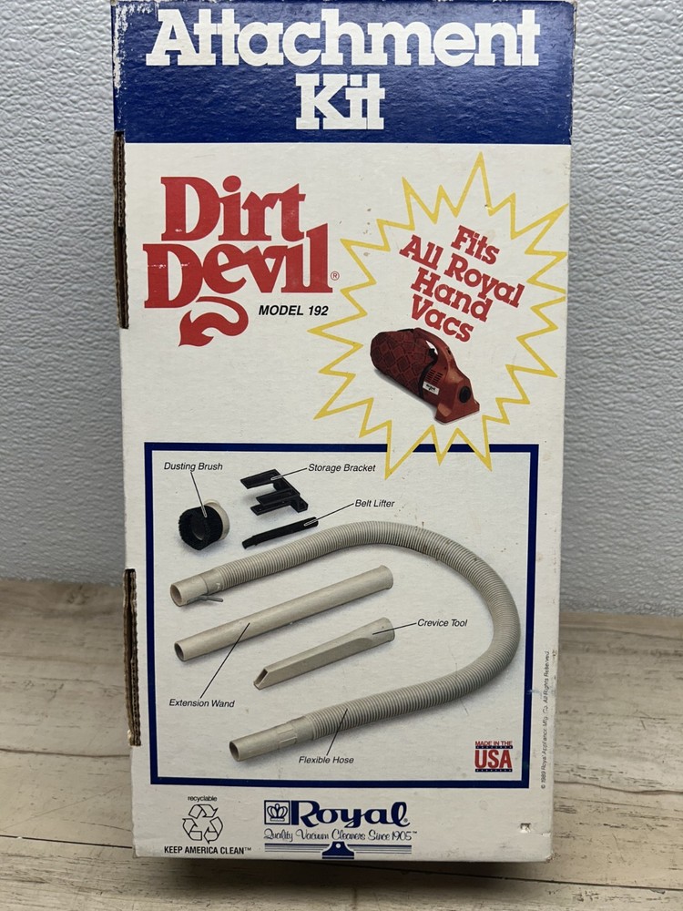 Dirt Devil Royal Ultra Portable Corded Bagged Hand Vacuum W/ Accessories M08230C.Fully tested and everything works great.It comes with attachment kit,extra belt and 7 extra bags.All items have normal signs of age and use-PLEASE see all pictures for details.No cracks,no chips,no broken or missing parts