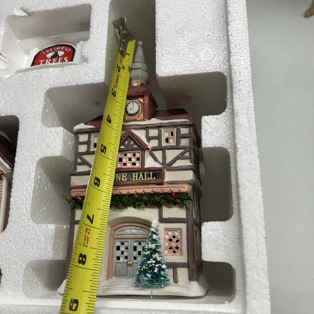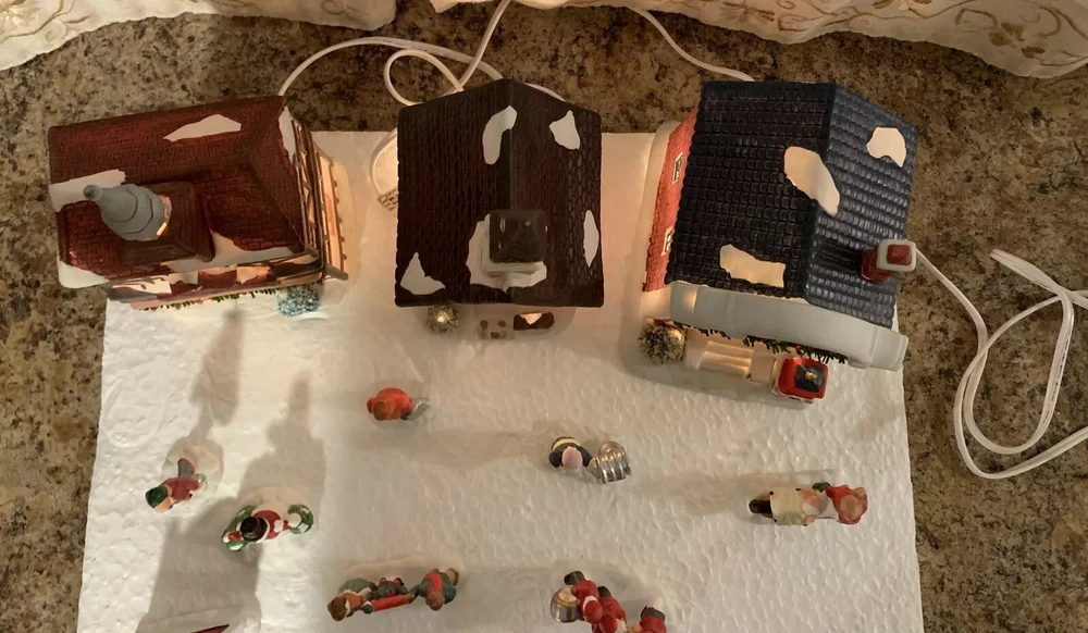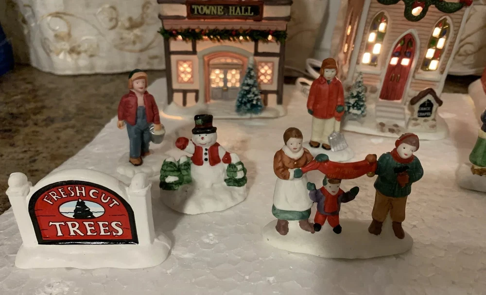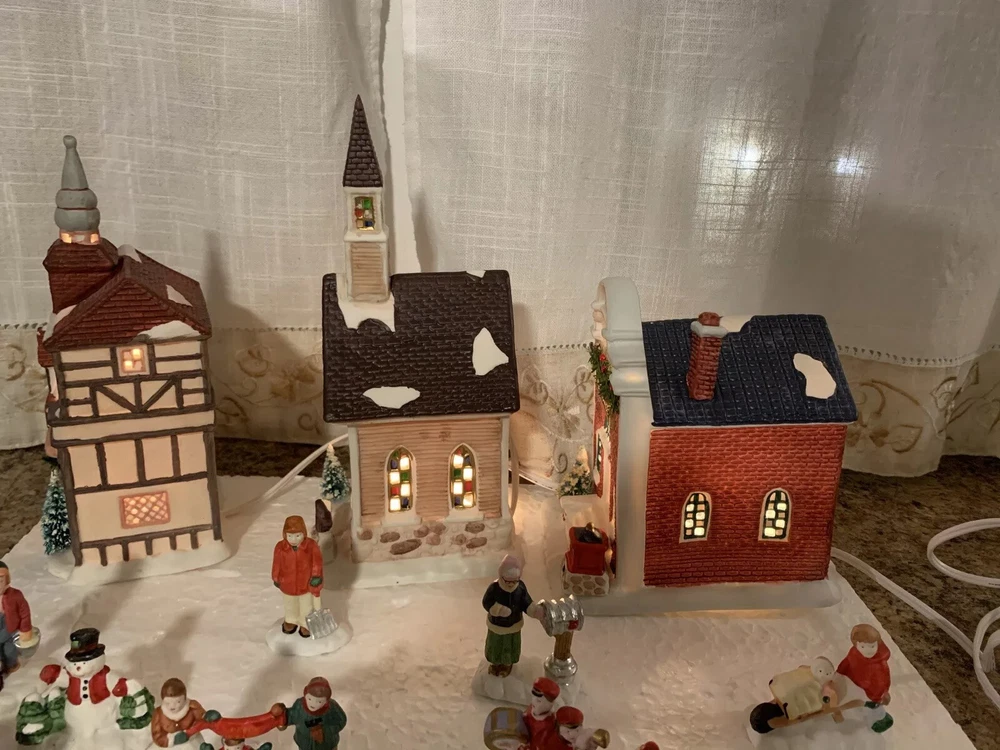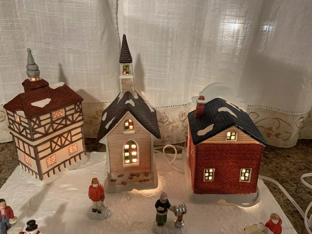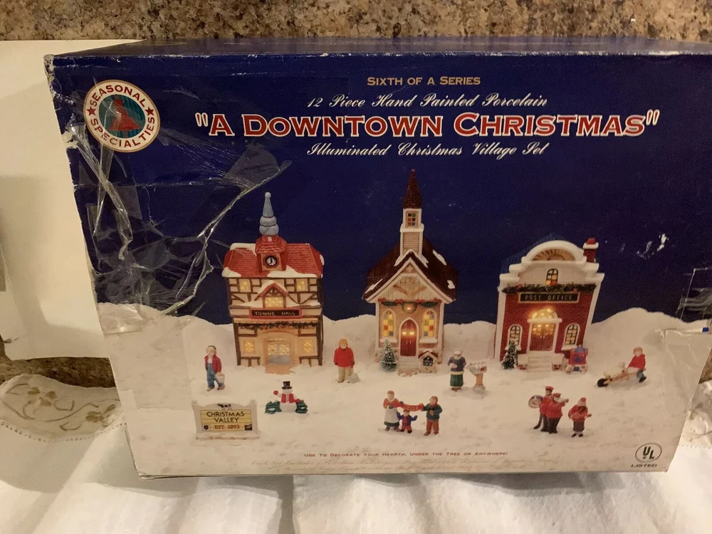 Up for sale is seasonal specialties a downtown Christmas. 12 piece hand-painted porcelain illuminated Christmas village set. What you see in the photos is what you will be receiving the lights do work as seen in photos. This is a vintage porcelain set that has normal wear from over the years there was some paint loss, the church at the very top Has a very tiny chip that is not very nice noticeable may be able to be touched up. Some figurines I have paint loss. Comes with original box and Styrofoam, the box does have wear, it is torn and taped together. Please see all photos for details and conditioners set will be sold as is thank you Boxed BW