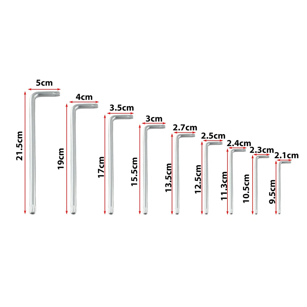 Product Description Features: *Forged with high quality chrome vanadium steel material, high hardness, toughness, large torque and long life; *The multiple specification for Torx Hex key including 9 sizes can be used in different scenarios. *Extended handle, labor-saving, convenient , suitable for car repair, machine repair and other fields; Specifications: *Material: Chrome vanadium steel *Color: as shown *Model: for T10, T15, T20, T25, T27, T30, T40, T45, T50 *Size: As picture show *Quantity: 9 pieces Package Contents: 9 * for Torx Key Note: 1. The real color of the item may be slightly different from the pictures shown on website caused by many factors such as brightness of your monitor and light brightness. 2. Please allow slight manual measurement deviation for the data. Payment Payment must be completed within 5 days. If you have any problems about payment, please contact us via ebay message. Delivery details We only ship to confirmed ebay Order addresses. Please comfirm that your Order address is in line with your shipping address. Please kindly note that the c ombined shipping is not provided because the shipping fee is calculated by weight. Also, the each additional item means exactly the the same color and size. It takes about 7 -15 working days to US; about 10-30 working days to other countries. Transit time may be a little delayed because of the bad weather and customs inspection . If you do not receive your item within 30 working days since payment finished, please contact us immediately for further assistance. Contact us We strive for 100% customer satisfaction! Positive Feedback is very important to us. If you have any questions, p lease feel free to contact us via "Ask seller a question" . We will reply your email within 24 working hours.