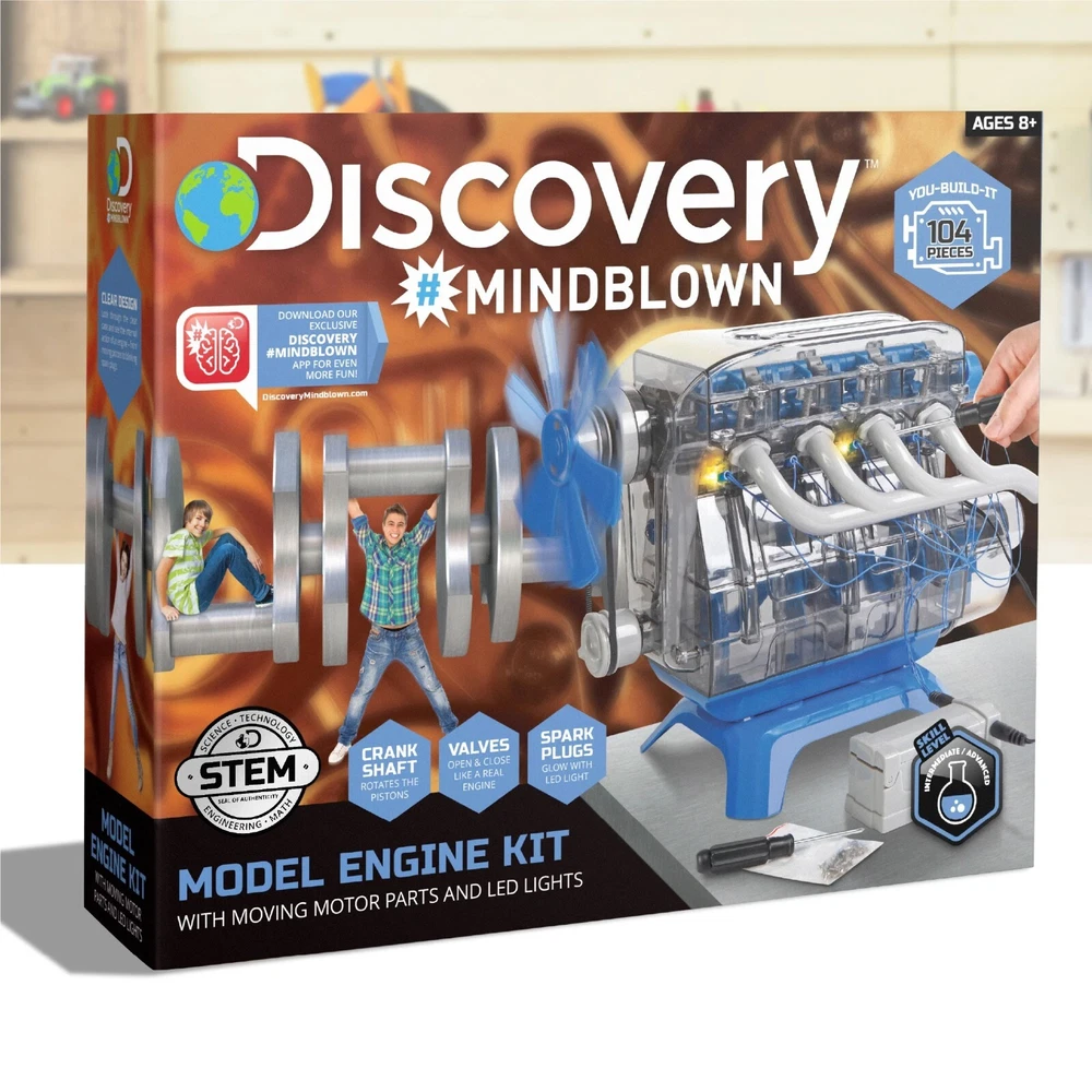 Discovery #Mindblown Model Engine Kit for Children, with Moving Motor Parts and LED Lights About this item Product details Does your child dream about creating the next greatest invention? Want a fun, exciting way to keep them entertained? Let your little girl or boy get hands on with this build it yourself mini replica of a classic four cycle internal combustion gasoline car engine! This intuitive, engaging gadget allows children to play around with the valves, cylinders, cranks, and pistons all in one dazzling toy. It also delivers powerful action using the provided cables and battery pack distributor to bring on nonstop fun anyone will love! Deliver this amazing toy for your favorite little engineer with Discovery™ #Mindblown DIY Model Engine Kit! It's a great way for anyone to explore their creativity, expand their critical thinking skills, and dive into the world of mechanical engineering! 3.52 lb. Elementary school STEM science-based learning. Discovery™ #Mindblown DIY Toy model Engine Kit Interconnecting hardware/components allow DIY construction Kit shows off the features of an internal combustion engine Made with durable plastic Develop their critical thinking skills Make the world of STEM amazing for your child Elementary school STEM science-based learning Model: 1013115 Brand Discovery #MINDBLOWN Assembled Product Weight 3.52 lb Manufacturer Part Number 1013115 Assembled Product Dimensions (L x W x H) 10.75 x 6.50 x 8.75 Inches Directions Fabric Care Instructions Spot Clean Only