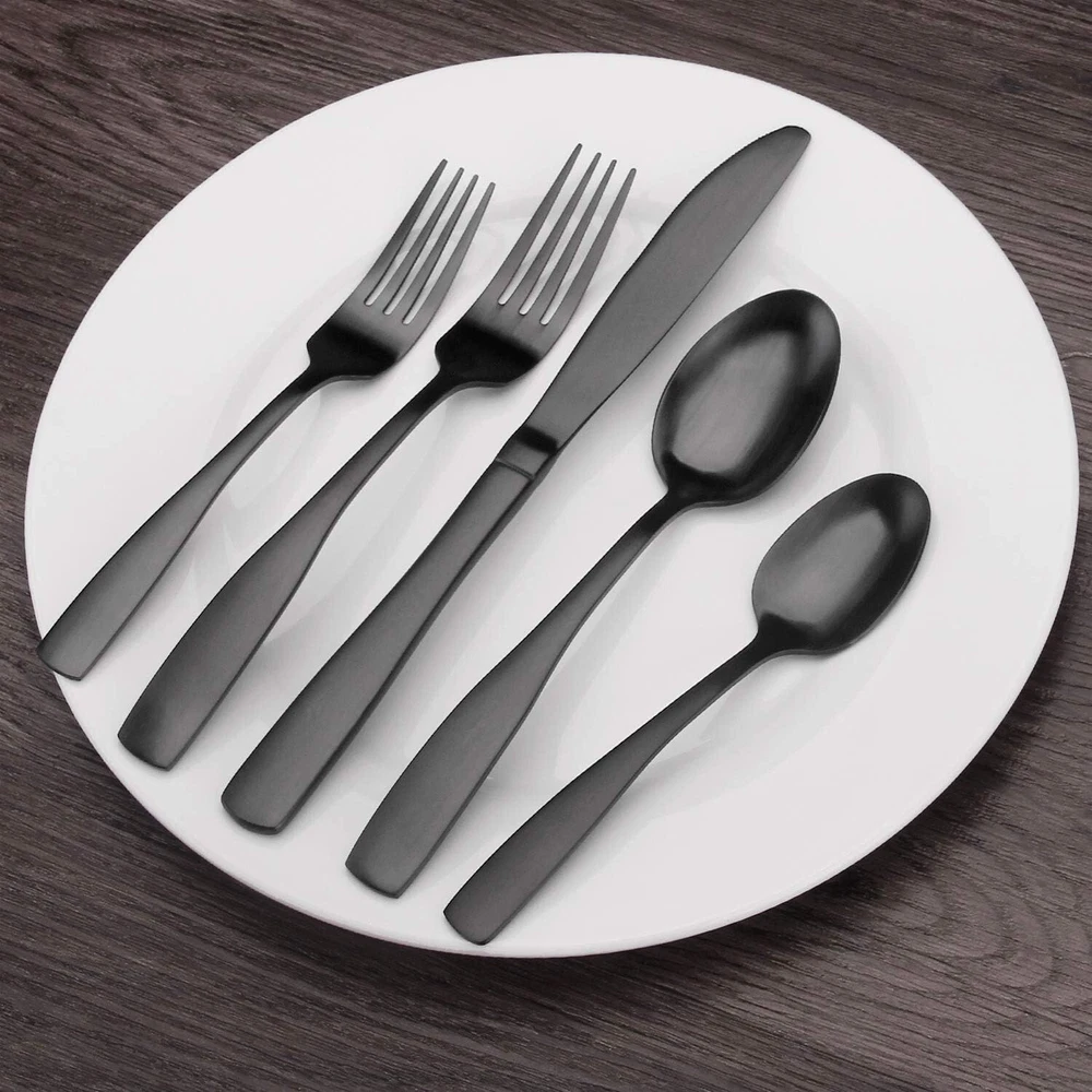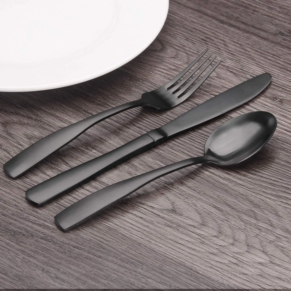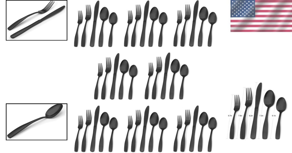 Department: Adults Number of Items in Set: 40 Type: Set Brand: Unbranded Features: Dishwasher Safe, Corrosion Resistant UPC: Does not apply Style: Modern Finish Type: Matte,satin gtin13: Does not apply Is Dishwasher Safe: Yes Color: Matte Black Service For: 8 Special Feature: Corrosion Resistant Package Dimensions: 10.2 X 3.15 X 2.56 Inches Care Instructions: Hand Wash Only Is Stain Resistant: Yes Material: Stainless Steel Recommended Uses For Product: [both] Handle Material: Stainless Steel Personalize: No Item Weight: 3.85 lb Product Care Instructions: Hand Wash Only, Dishwasher Safe Set Includes: Fork, Dessert Fork, Dinner Fork, Dessert Spoon, Dinner Spoon, Dinner Knife Finish: Matte Number Of Pieces: 40