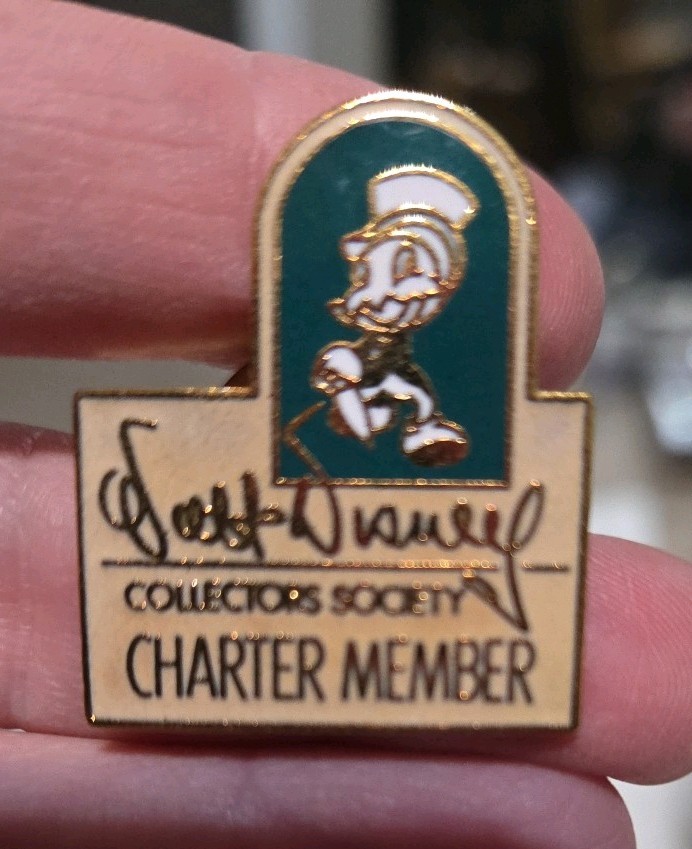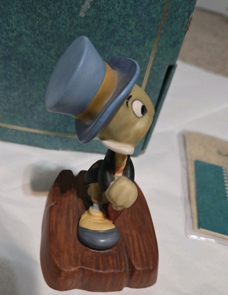 The product is a Disney 1993 WDCC Pinocchio's Jiminy Cricket membership figurine with a pin and certificate of authenticity. This figurine, standing at 3 3/4 inches tall, was manufactured in Thailand as part of the WDCC franchise. It is a collectible item that celebrates the Disney character Jiminy Cricket and is a part of Disneyana, making it a sought-after piece for fans and collectors alike. The figurine and pin are in like new condition. the box shows signs of storage wear - a stain on the side, a mark on the top, lightly warped cardboard as shown in photos.