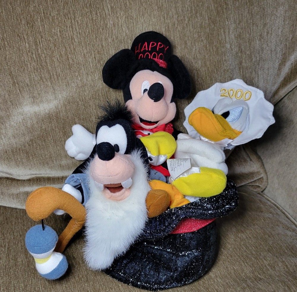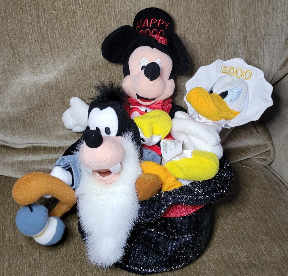 Disney New Years 2000 Mickey Mouse Father Time Goofy Baby Donald Duck Plush. From a smoke free home. Sewn in tags attached. Approximately 11" tall. 1107a