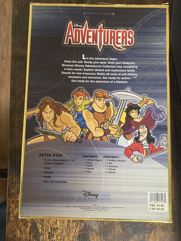 The Disney Store Disney Adventures Peter Pan 11.5" Poseable toy features the beloved character from the Disney franchise, Peter Pan. This poseable articulated toy is designed with attention to detail and includes accessories to enhance playtime. Box includes a bow, arrow, knife and axe.