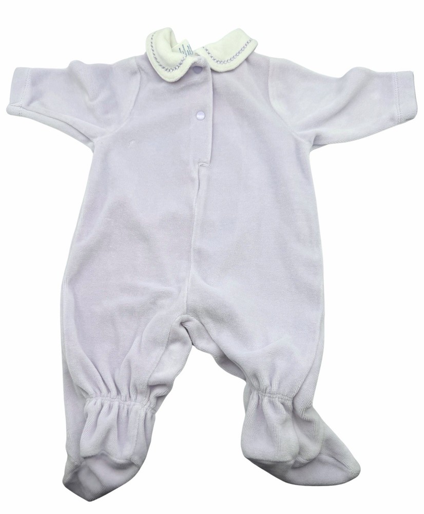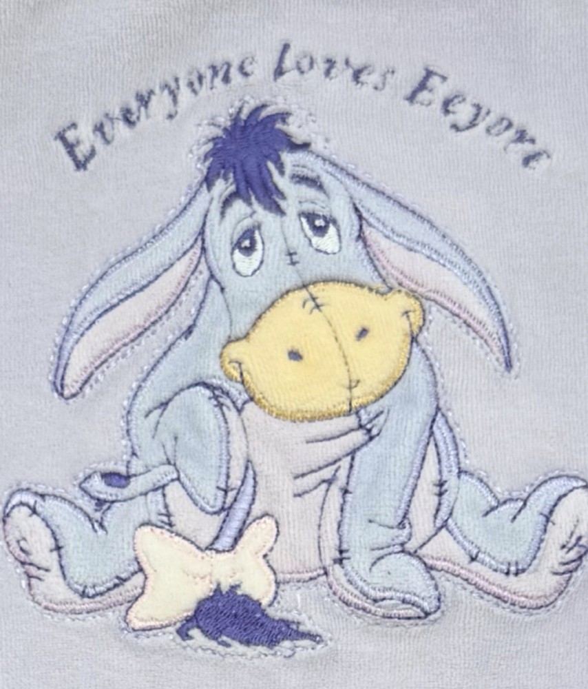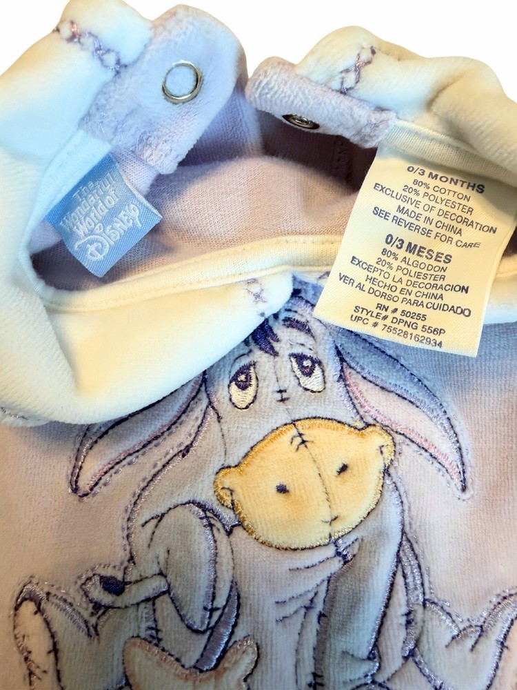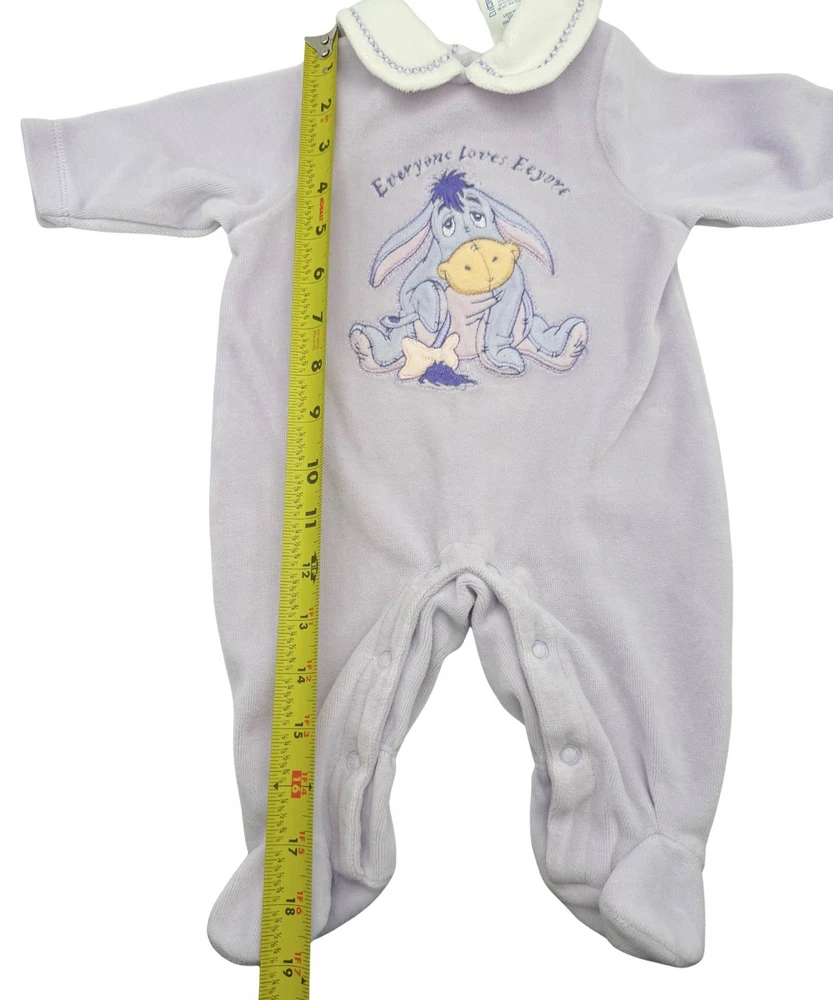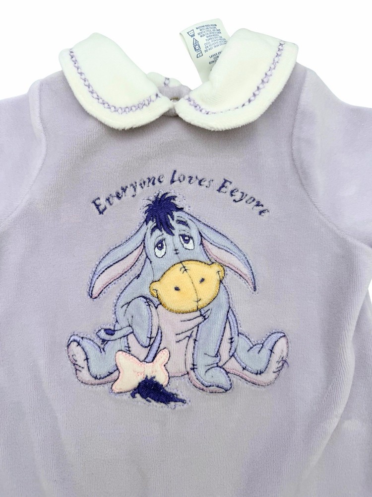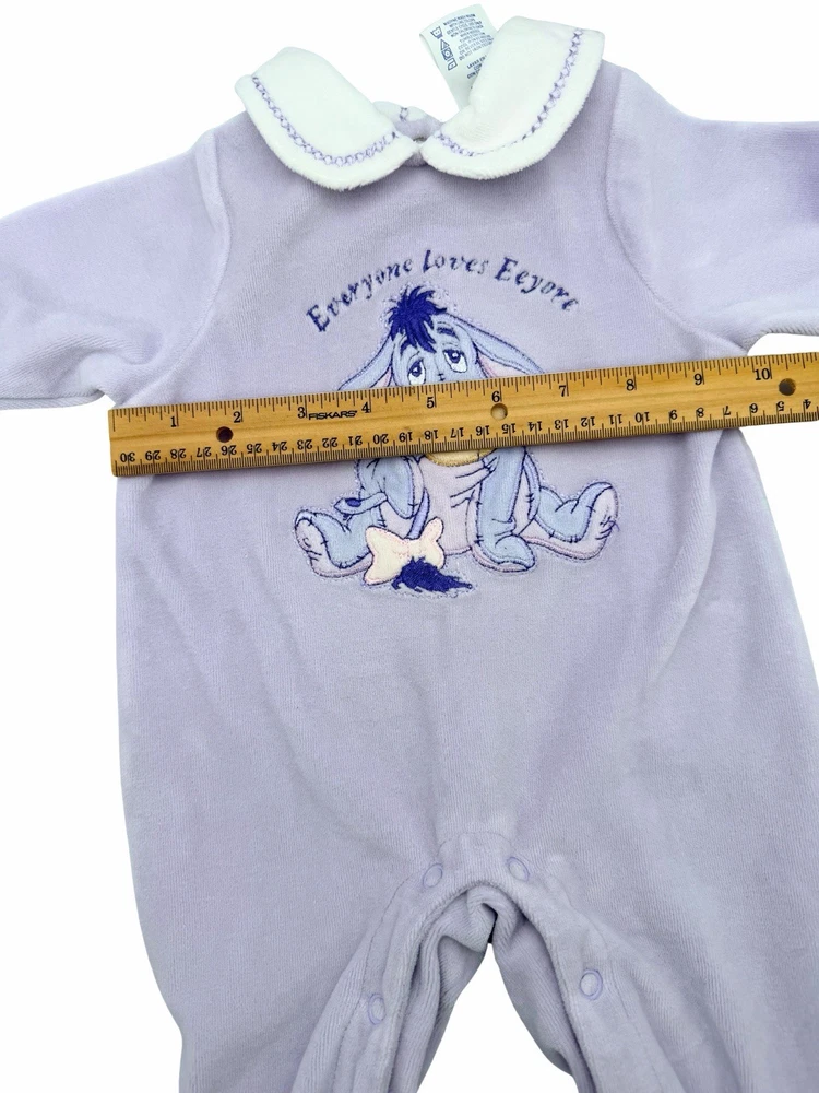 Sweet Disney Baby footed sleeper featuring embroidered Eeyore with “Everyone Loves Eeyore” detail. • Size: 0–3 Months • Brand: Disney Baby • Color: Soft blue with cream collar • Material: 80% Cotton / 20% Polyester • Style: Long sleeve, footed one-piece with snap closure Measurements (approximate): • Total length: ~19” • Pit to pit: ~9.5” Condition: Good preowned condition. No holes or major flaws noted. Light normal wear consistent with gentle use. Embroidery is bright and intact. Perfect cozy sleeper or adorable vintage-style Disney piece for collectors or everyday wear.