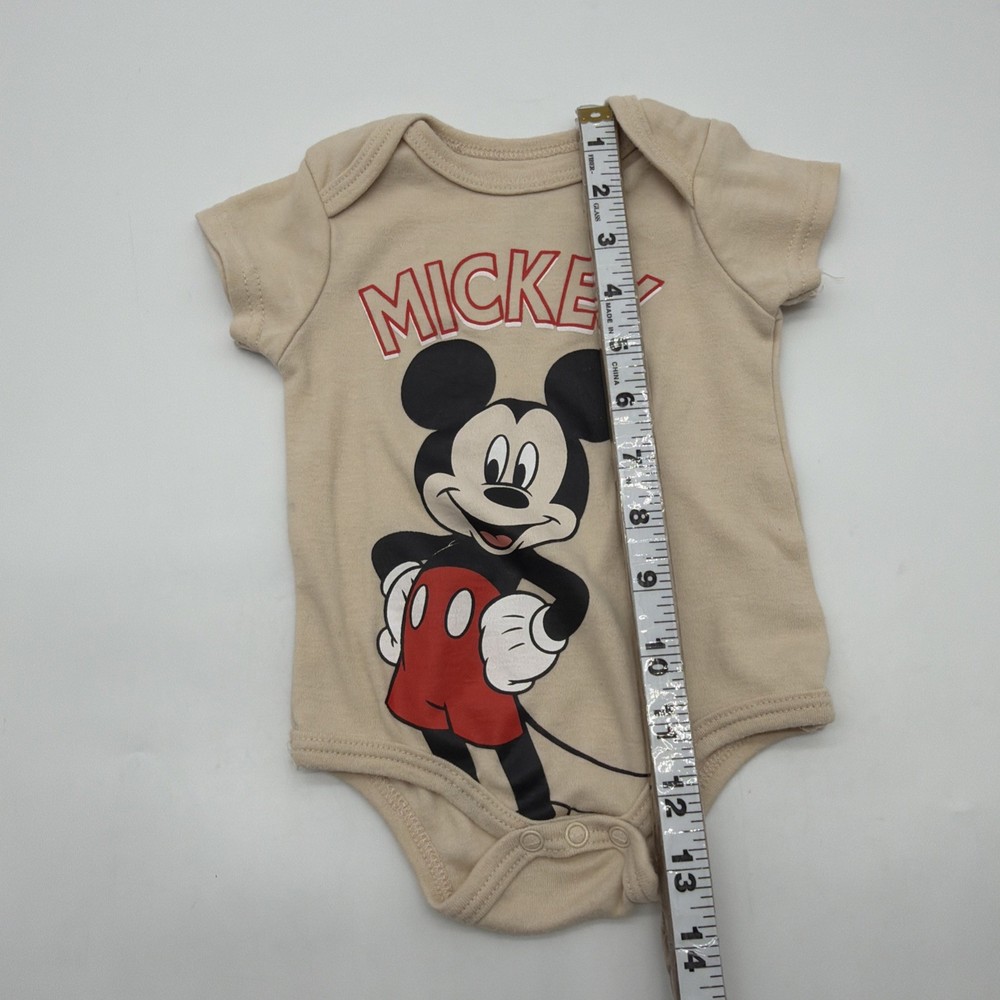 The Disney Baby One Toddler Girls Size 6-9M Beige Graphic Print Logo Snap bodysuit features a cute Mickey Mouse character design on a solid beige background. With short sleeves, chest snap closure, and a crew neckline, this one-piece outfit is perfect for travel, parties, or casual wear. The bodysuit is made from comfortable fabric and is suitable for all seasons, making it a versatile addition to any young girl's wardrobe. Perfect for walking, beach outings, or running and jogging, this stylish Disney Baby outfit is sure to delight both parents and little ones alike. Check pictures for flaws and measurements