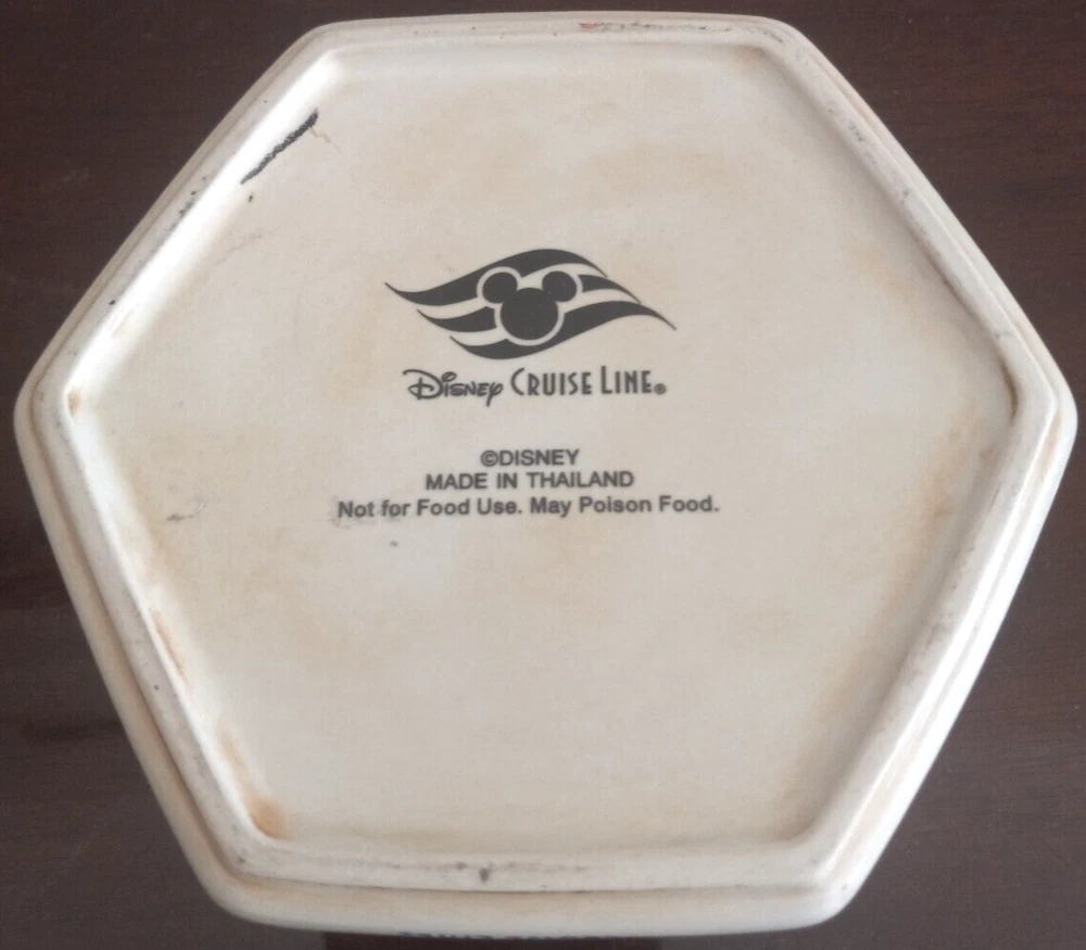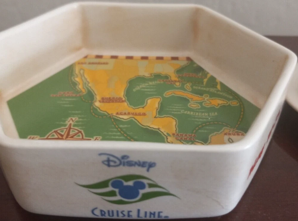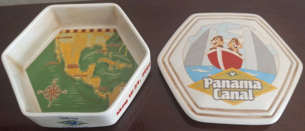 The product is a Disney Cruise Lines trinket box featuring the navigation path of the cruise line ship in 2008 through the Panama Canal. The design includes a magic ship theme and was manufactured in Panama. The item is part of the Disney franchise and falls under the category of collectibles.