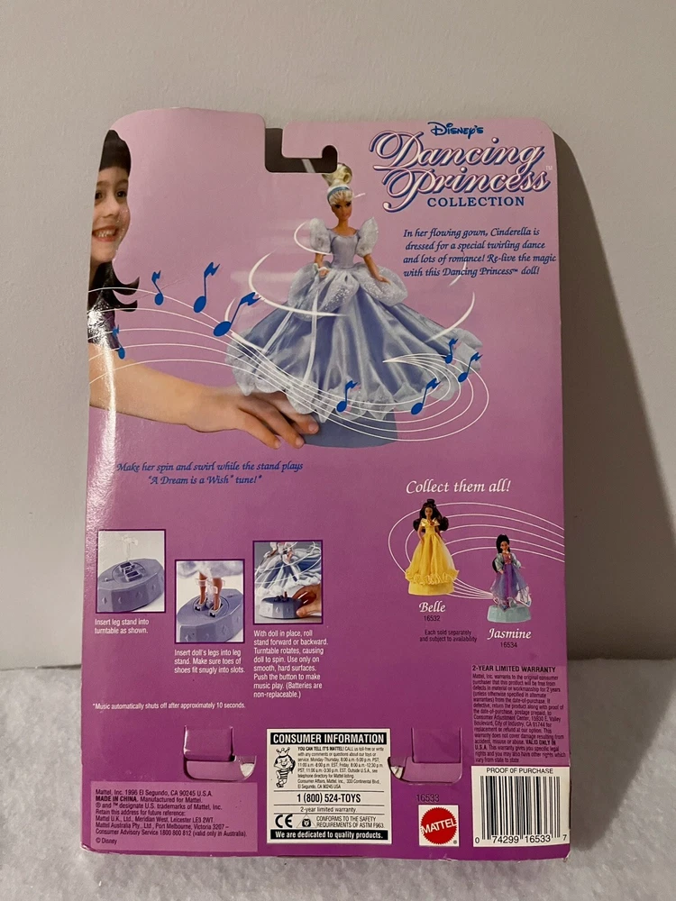 Experience the enchantment of Disney's Cinderella with this Dancing Princess Edition Cinderella doll. This fashion doll stands approximately 11 inches tall. She is dressed in her signature, flowing light blue gown along with a leg stand, making it easy for her to dance to “A Dream Is A Wish Your Heart Makes.” (OSNIB)