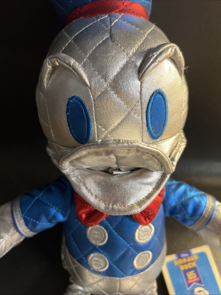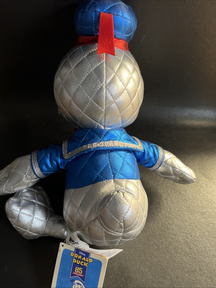 Celebrate a classic with the Disney Donald Duck 85th Anniversary Metallic 15" Plush, a special edition collectible that shines in any Disneyana collection. This plush toy, adorned with shimmering metallic accents, honors the beloved character's enduring legacy and adds a touch of sparkle to your display. Crafted with care and attention to detail, this plush is a testament to the enduring charm of Donald Duck. Perfect for fans and collectors alike, it's a delightful nod to the whimsical world of Disney, ready to take its place as a treasured keepsake in your home or office.
