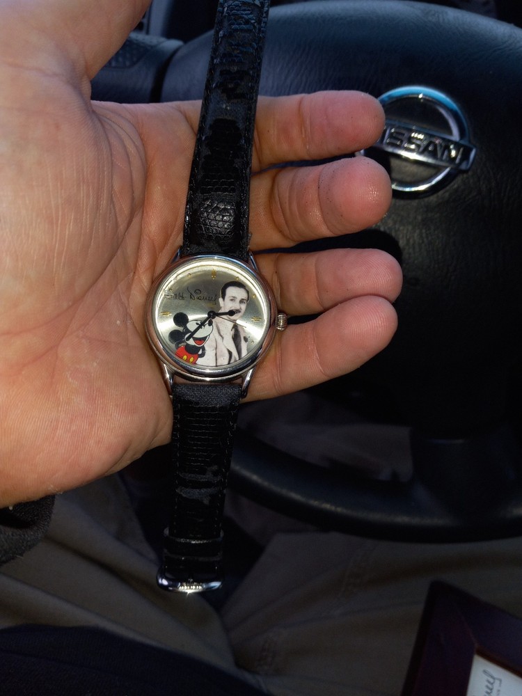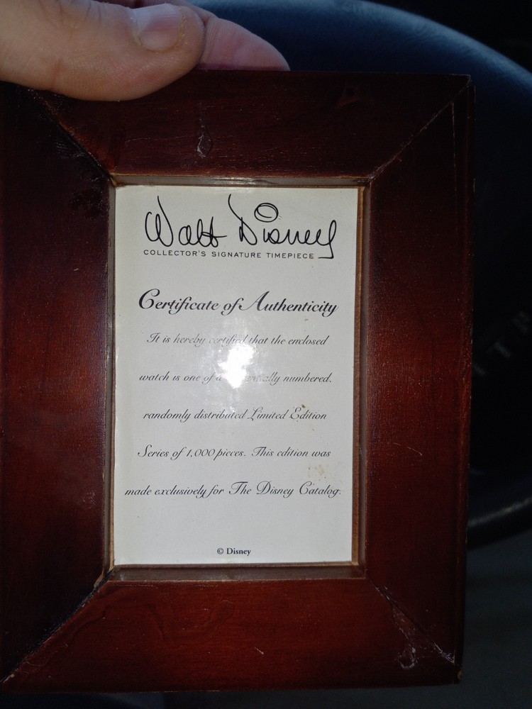 The Disney Exclusive Walt Disney & Mickey Mouse Watch with Matching Box is a special timepiece featuring characters from the Disney franchise. Made in Taiwan, this watch showcases the iconic Walt Disney and Mickey Mouse, making it a unique and collectible item for fans of Disneyana. The matching box adds an extra touch of charm and keepsake value to this exclusive Disney product. Used 1 of 1000 as shown in the picture is used and haven't put battery in and the strap has wear on it the box also has scuffs not perfect but all there and others are selling for 350 to 450 here