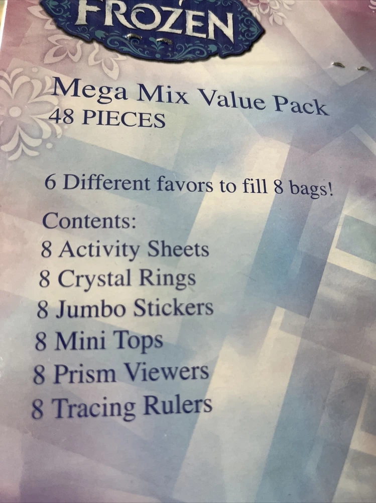 Disney Frozen 48pc Mega Mix Value Pack Party Pack Rings Stickers Tracing Rulers Disney Frozen MEGA MIX VALUE PACK 48 PIECES 6 DIFFERENT FAVORS TO FILL 8 BAGS ! CONTENTS: 8 - ACTIVITY SHEETS 8 - CRYSTAL RINGS 8 - JUMBO STICKERS 8 - MINI TOPS 8 - PRISM VIEWERS 8 - TRACING RULERS BRAND NEW ! BUY MORE SAVE MORE ! NOT FOR CHILDREN UNDER 3 YEARS OLD ! SMALL PART ADVISORY !!!