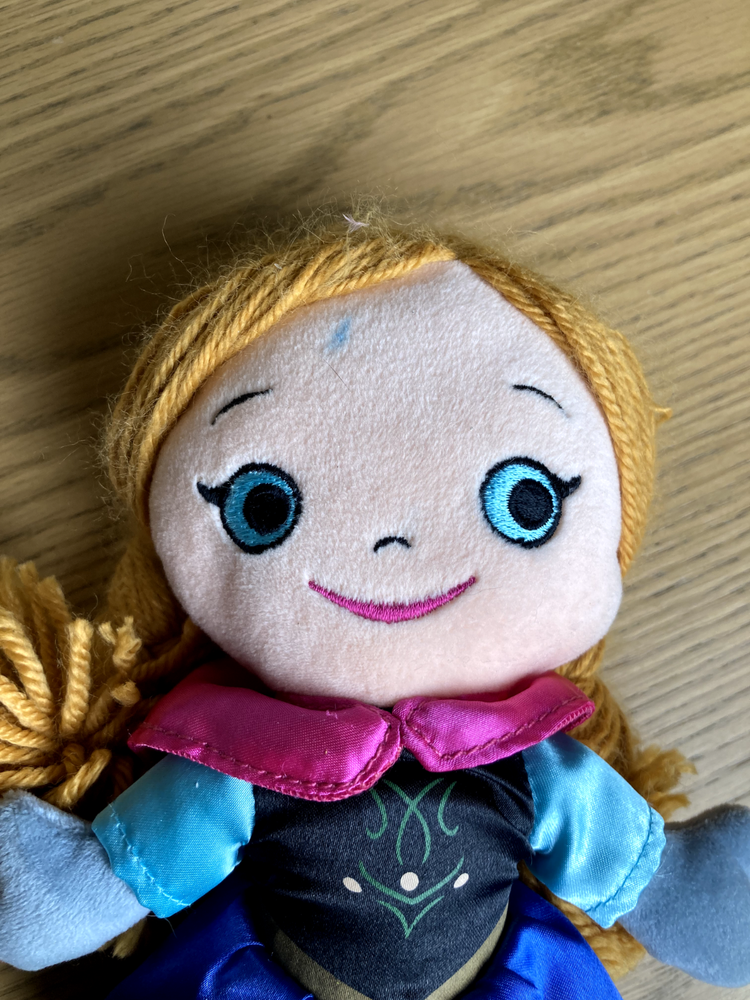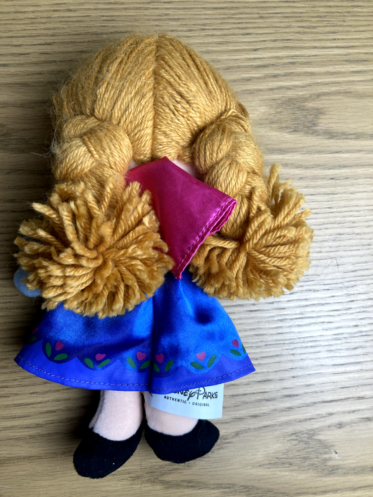 This adorable Anna plush is so soft and cute—perfect for any Frozen fan! The red yarn hair adds a nice touch, and the small blue stain is barely noticeable. Great preowned condition at a fantastic price!
