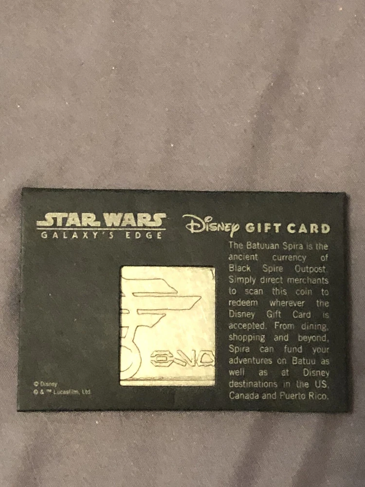 Disney Gift Card Star Wars Galaxy Edge Black Spire Outpost Gift Card $0 VALUE. This is probably one of the coolest souvenirs you can bring back from Galaxy’s Edge and not many people know about it. This is the official currency of Galaxy’s Edge. This gift card has 0$ value but you can put any amount of money you want on it and use it around all 4 Disney world parks to pay for things and the cool part is that you get to keep it as a souvenir after your done using it and have no more money left on it. Its a great item and it has some weight on it. It feels as if you are part of the star wars land when your there using it. The only reason I labeled it as used and not new is because I did buy and put credits on it. But other than that I have only used it once to buy my Droid and then saved it to bring it home. Your going to love this item and you will not be able to get this anywhere else other than at Galaxy’s Edge. Get it before it is gone!