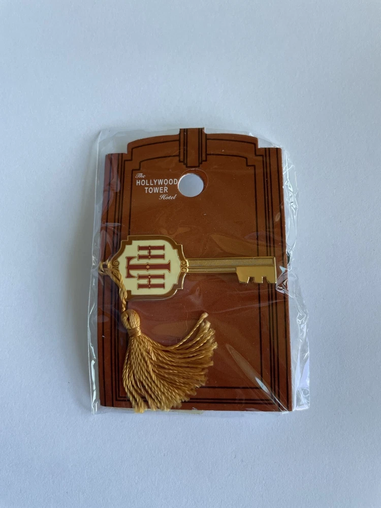Disney Hollywood Tower Of Terror Hotel HTH GOLD Key With White Background/Tassel. BRAND NEW, still in original packaging. Open edition pin in the shape of a key with the HTHHollywood Tower Hotel logo on it and an actual tassle on the end of the key.The background for the logo is yellow and the letters are red. It is a goldtone pin approximately 1.8" in size. Back of pin: "Official PinTrading 2004" "The Twilight Zone © CBS Inc." "©DisneyChina" Adding for search purposes: tassel