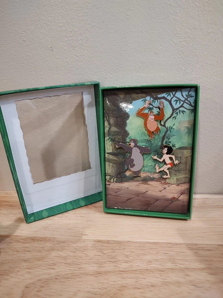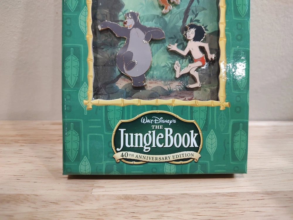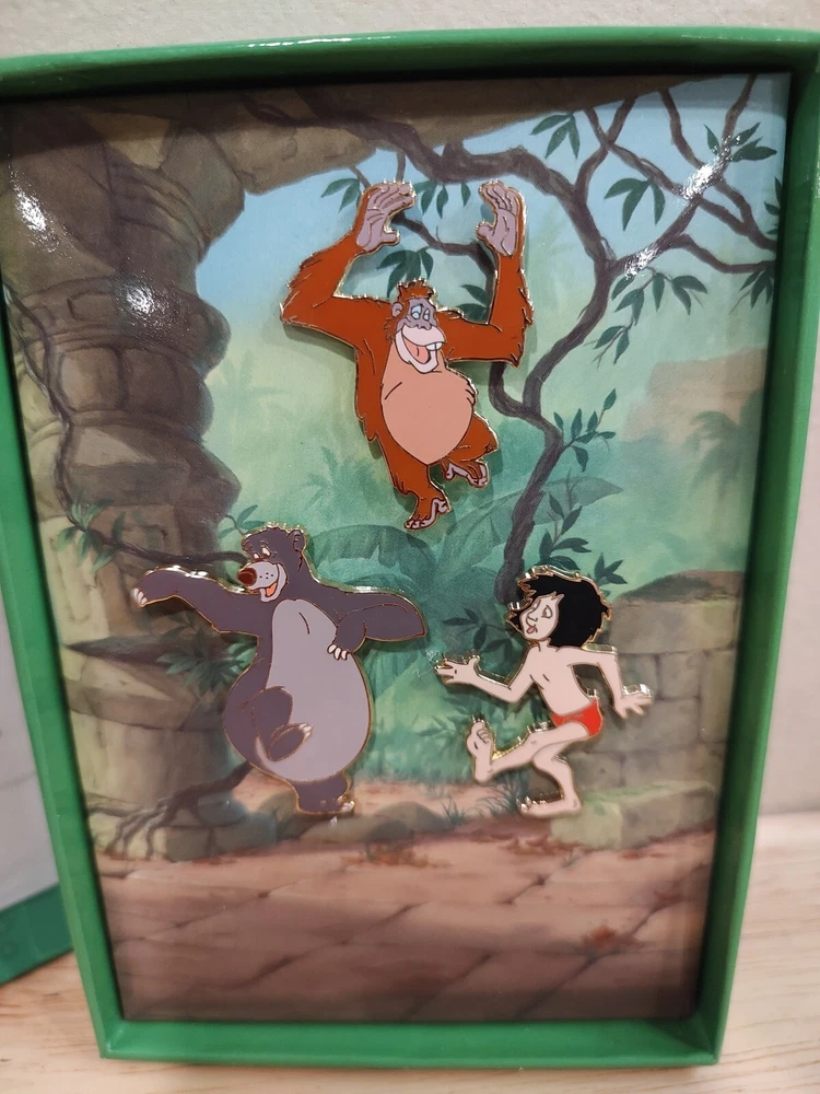 Disney Jungle Book 40th Anniversary Edition Set Of 3 Hat/Pins Moglie Baloo Louie, very nice, box is 6"x4", pins are approximately 1.5"-2" each. Never removed from box.