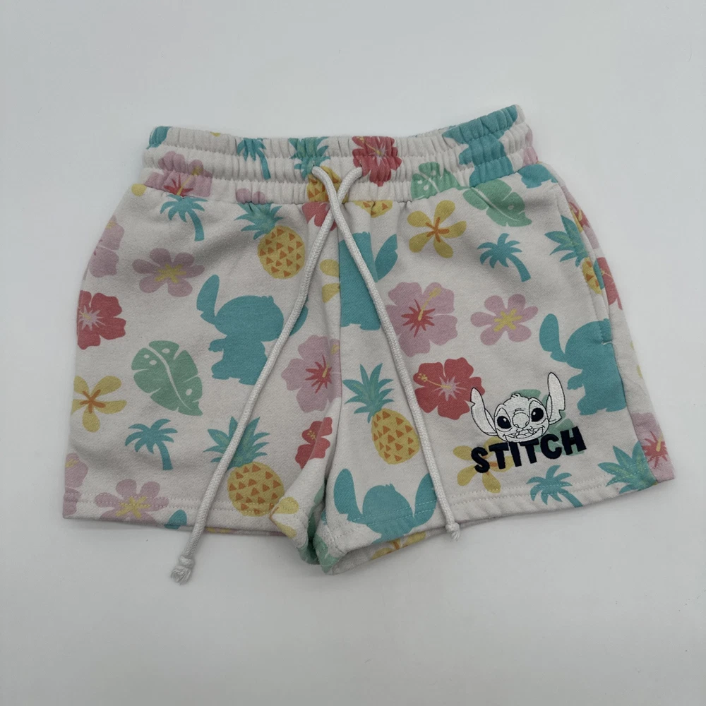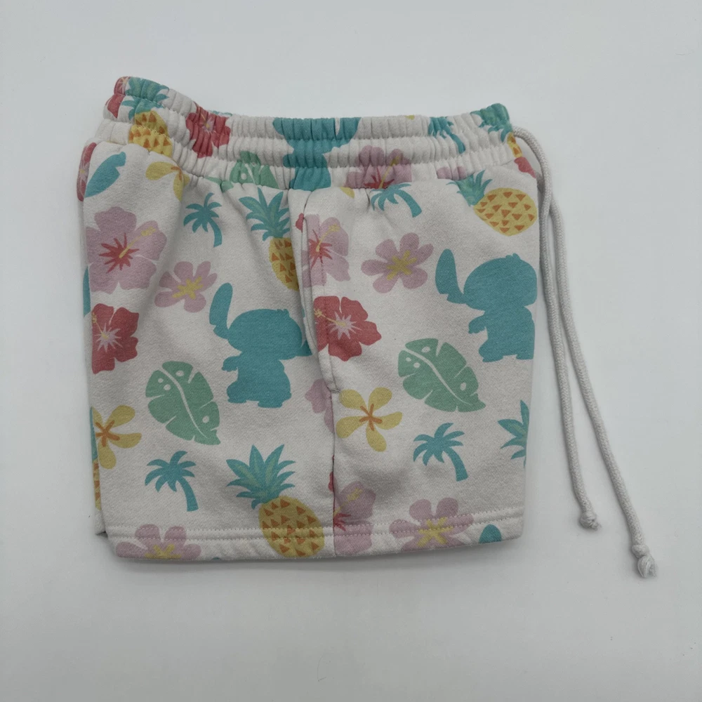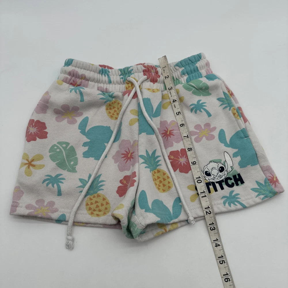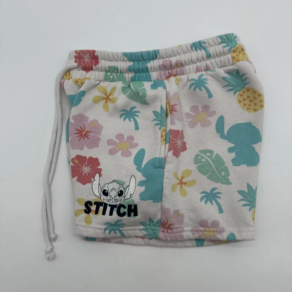 Women's Disney Lilo & Stitch shorts in size small, featuring a tropical all-over print with floral design. The shorts have a relaxed fit with a lace-up closure and pockets, including a coin pocket. Made of a light wash polyester and cotton blend fabric. Perfect for casual occasions in the summer or spring, ideal for walking or beach activities. Brand: Disney. Check pictures for flaws and measurements